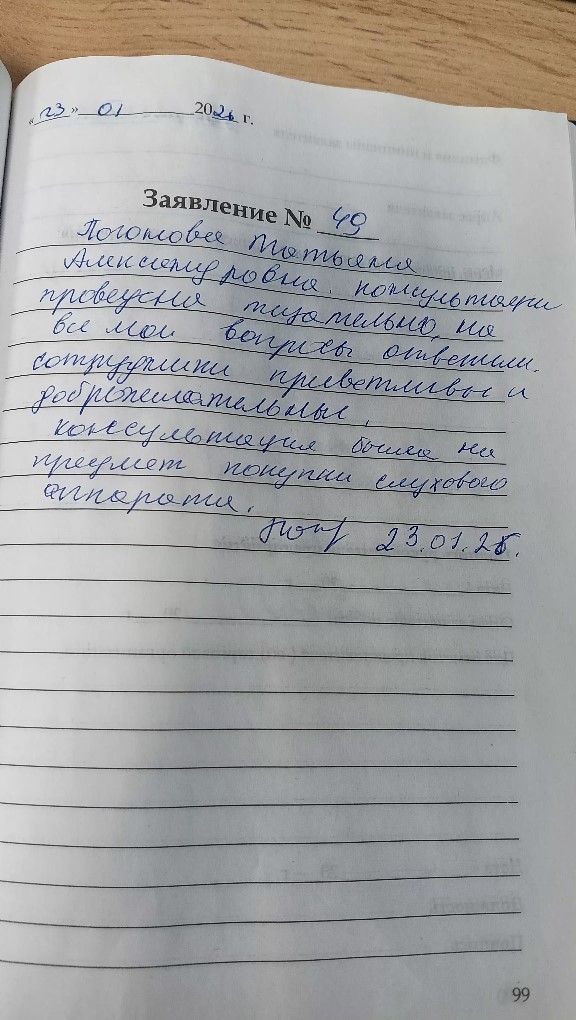 Консультация проведена тщательно ,на все мои вопросы ответили. Сотрудники приветливы и доброжелательные.Консультация была на предмет покупки слухового аппарата.