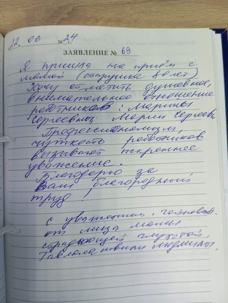 Я пришла на приём с мамой (старушка 80 лет). Хочу отметить душевное, внимательное отношение работников: Марины Сергеевны, Марии Сергеевны. Профессионализм, чуткость работников вызывают искреннее уважение.