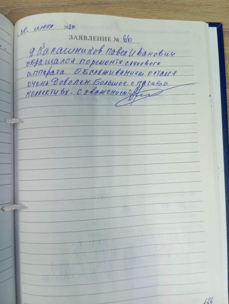 Я, Калашников Павел Иванович обращался по ремонту слухового аппарата. Обслуживанием остался очень доволен. Большое спасибо коллективу. С уважение, роспись.