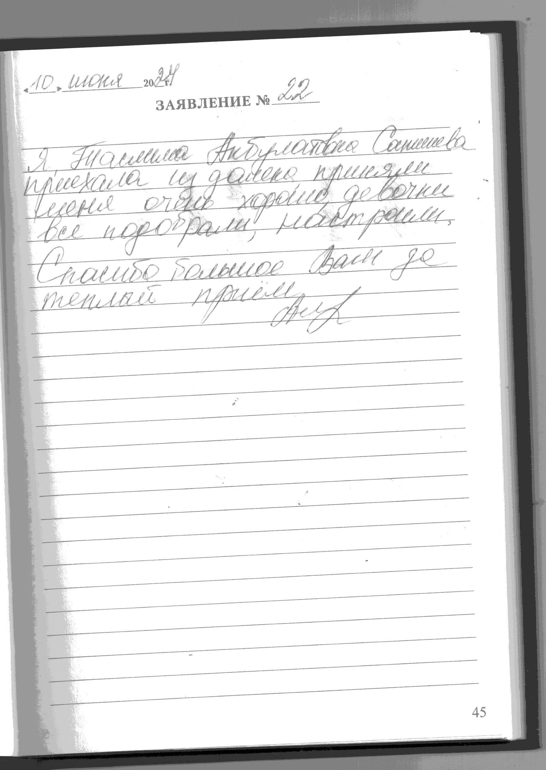 Я, Таслима Абдулатовна Санишева приехала из далека ,приняли меня очень хорошо, девочки все подобрали, настроили. Спасибо большое Вам за теплый прием.