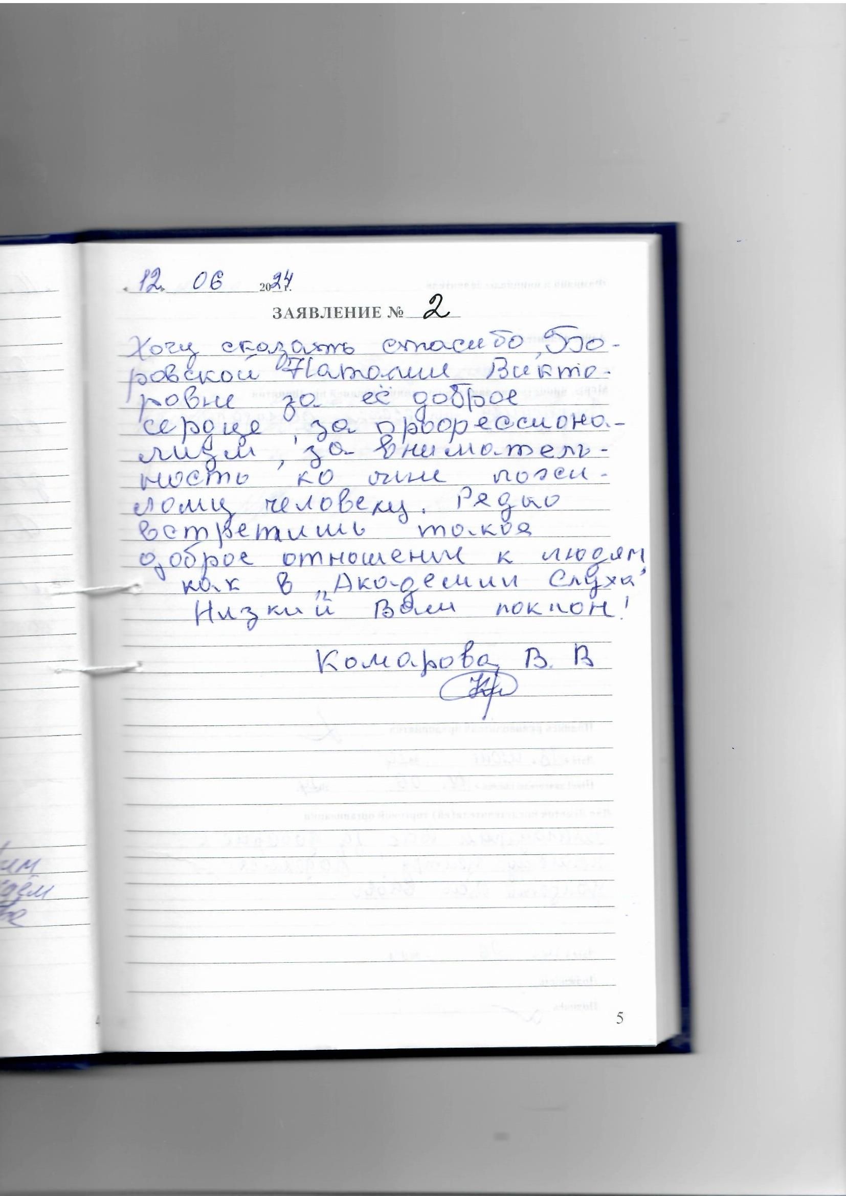 Хочу сказать спасибо, Боровской Наталии Викторовне за ее доброе сердце, за профессионализм, за внимательность ко мне пожилому человеку. Редко встретишь такое доброе отношение к людям, как в "Академии Слуха"