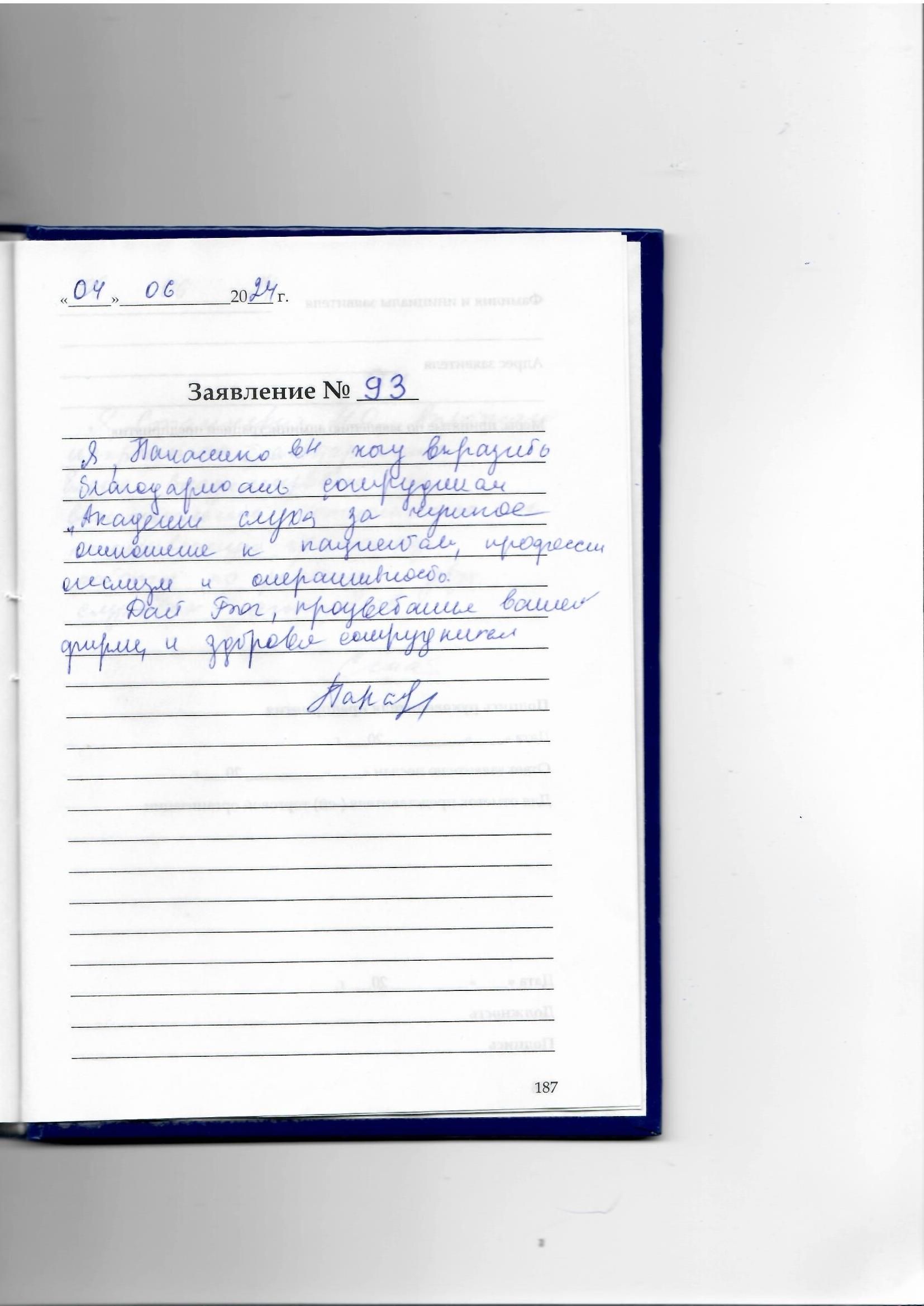 Я. Панасенко В.Н., хочу выразить благодарность сотрудникам "Академия слуха" за чуткое отношение к пациентам, профессионализм и оперативность.