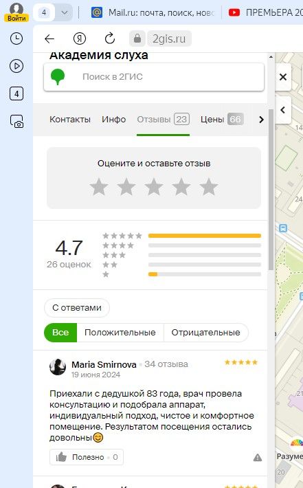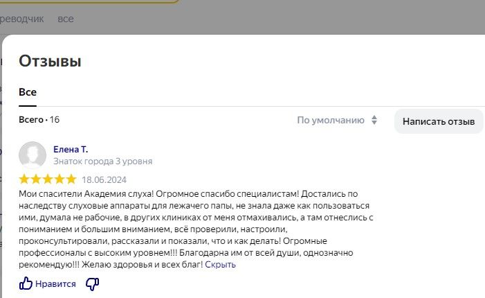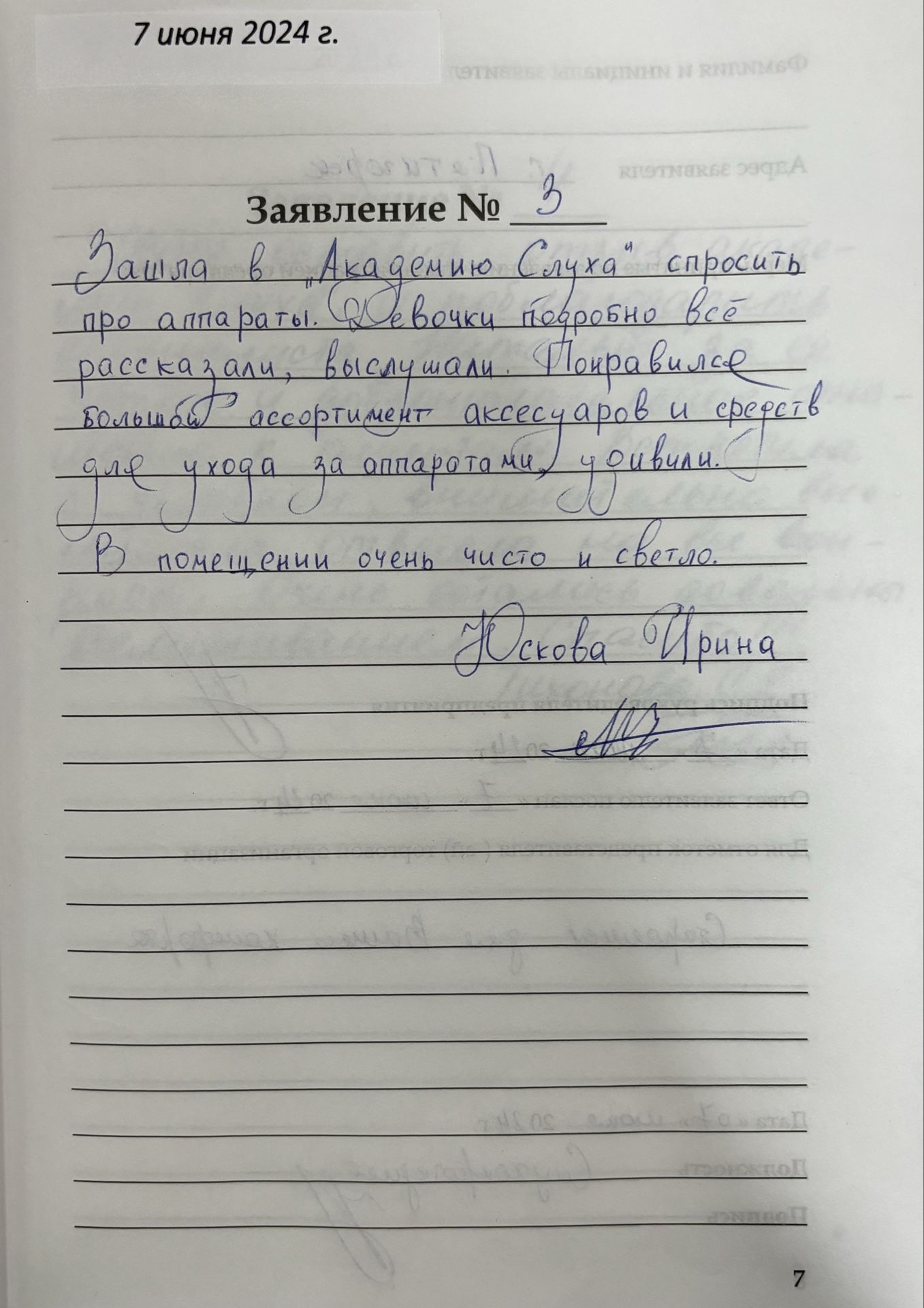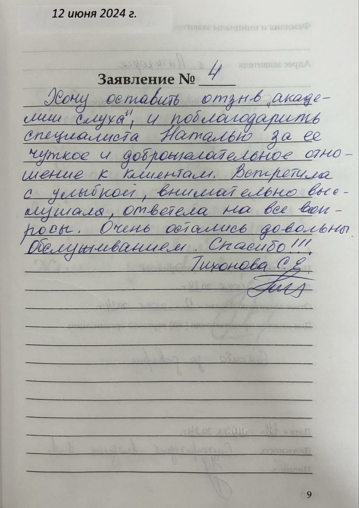 Хочу оставить отзыв «Академии Слуха» и поблагодарить специалиста Наталью за ее чуткое и доброжелательное отношение к клиентам. Встретила с улыбкой, внимательно выслушала, ответила на все вопросы. Очень остались довольны обслуживанием. Спасибо!!!