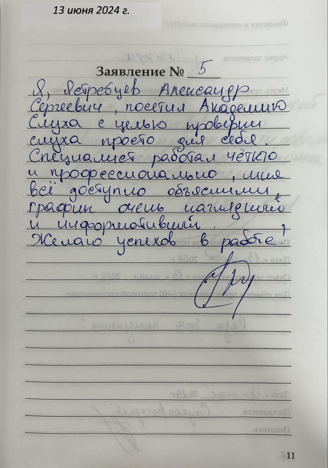 Я, Ястребцев Александр Сергеевич, посетил «Академию Слуха» с целью проверки слуха просто для себя. Специалист работал четко и профессионально, мне все доступно объяснили, график очень наглядный и информативный.