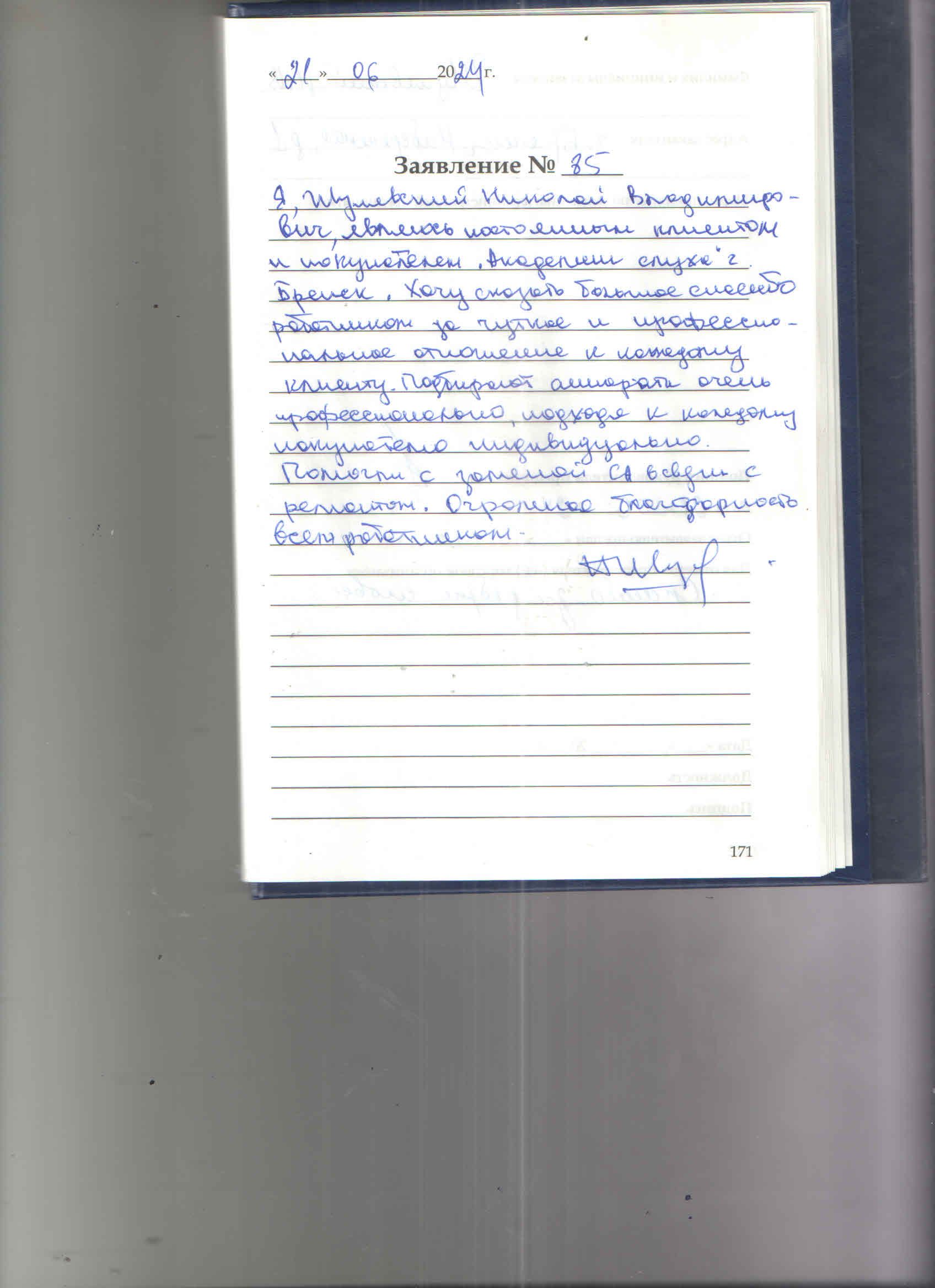 Я,Шулявский Николай Владимирович,являюсь постоянным клиентом и покупателем "Академии слуха"г.Брянск.Хочу сказать большое спасибо работникам за чуткое и профессиональное отношение к каждому клиенту.Подбирают аппараты профессионально, подходя к каждому покупателю индивидуально.Помогли с заменой аппаратов в связи с ремонтом.Огромная благодарность всем работникам.