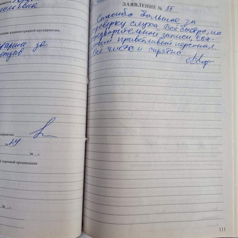 Спасибо большое за проверку слуха. Все быстро по предварительной записи, вежливый и приветливый персонал. Всё чисто и опрятно.