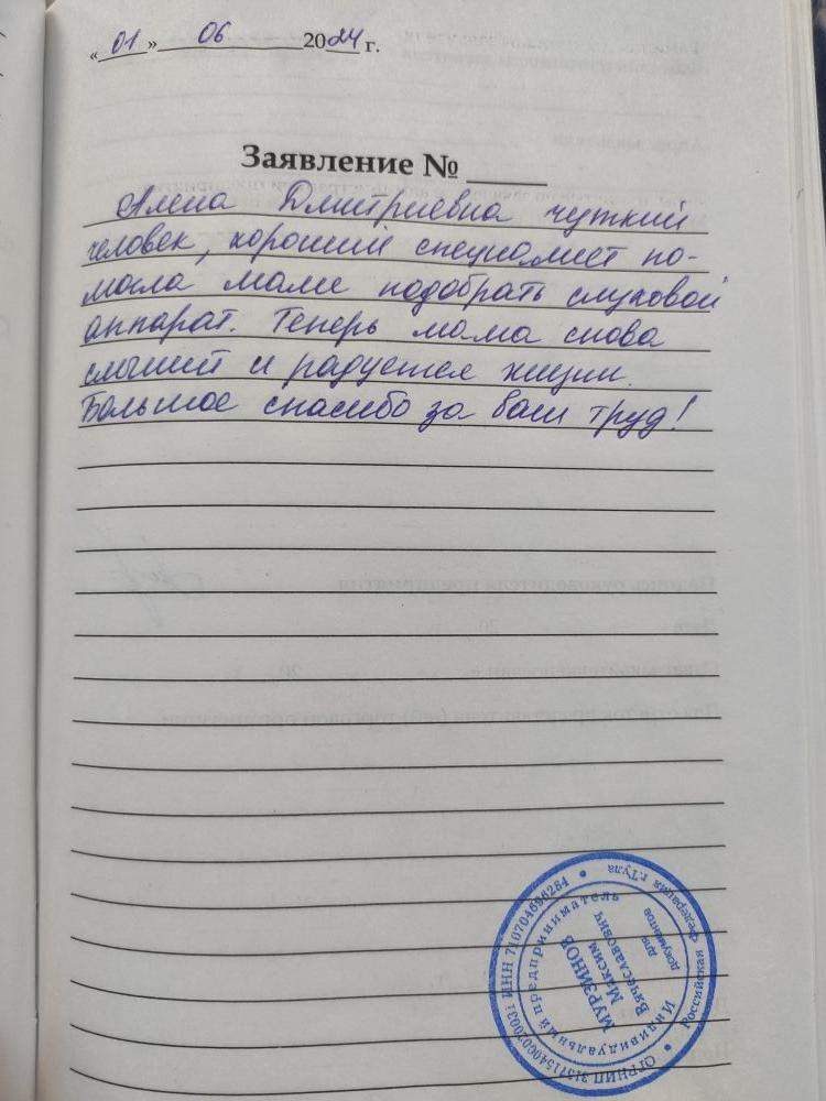 Алена Дмитриевна чуткий человек, хороший специалист помогла маме подобрать слуховой аппарат. Теперь мама снова слышит и радуется жизни. Большое спасибо за ваш труд!