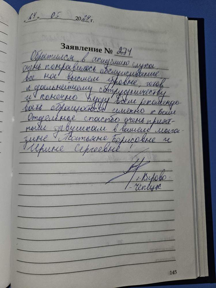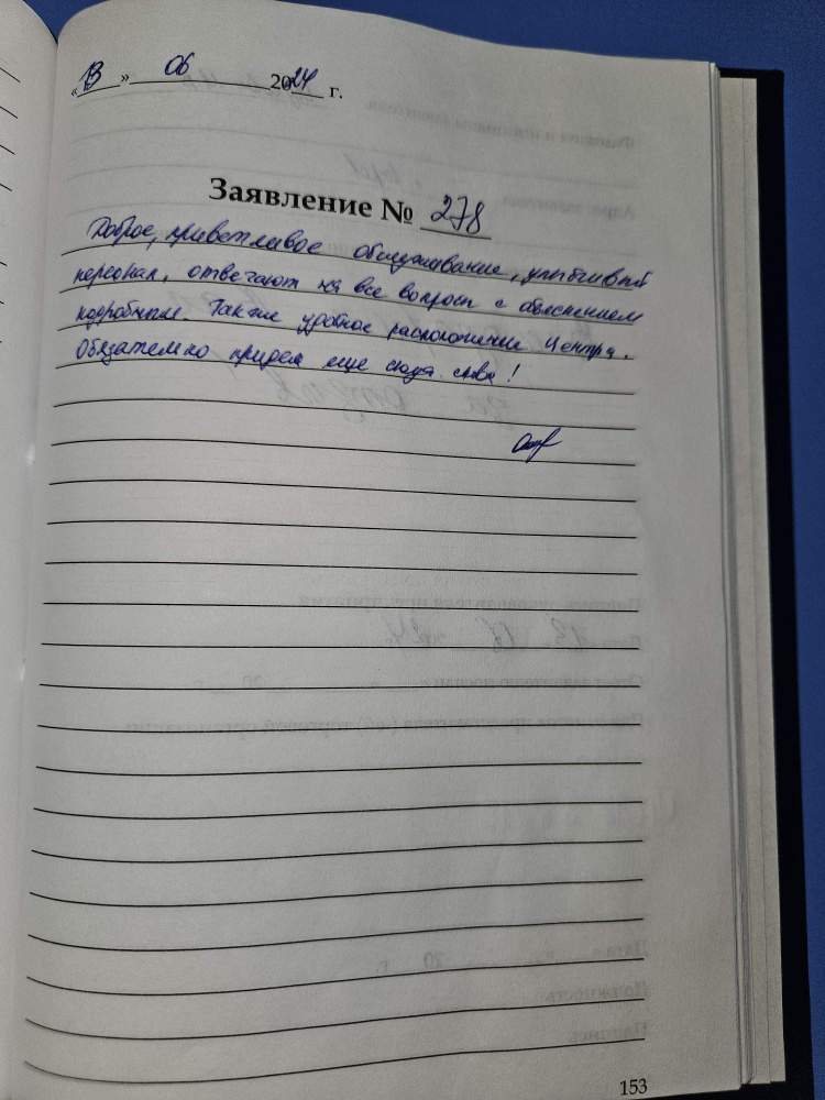 Доброе, приветливое обслуживание, улыбчивый персонал, отвечают на все вопросы с объяснением подробным. Также удобное расположение Центра. Обязательно придем сюда снова! Обухова М.В., г. Киров