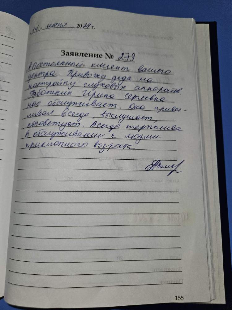 Я постоянный клиент вашего центра. Привожу деда на настройку слуховых аппаратов. Работник Ирина Сергеевна нас обслуживает. Она приветливая всегда, выслушает, посоветует. Всегда терпелива в обслуживании с людьми приклонного возраста. Смирнова Е.А., г. Киров