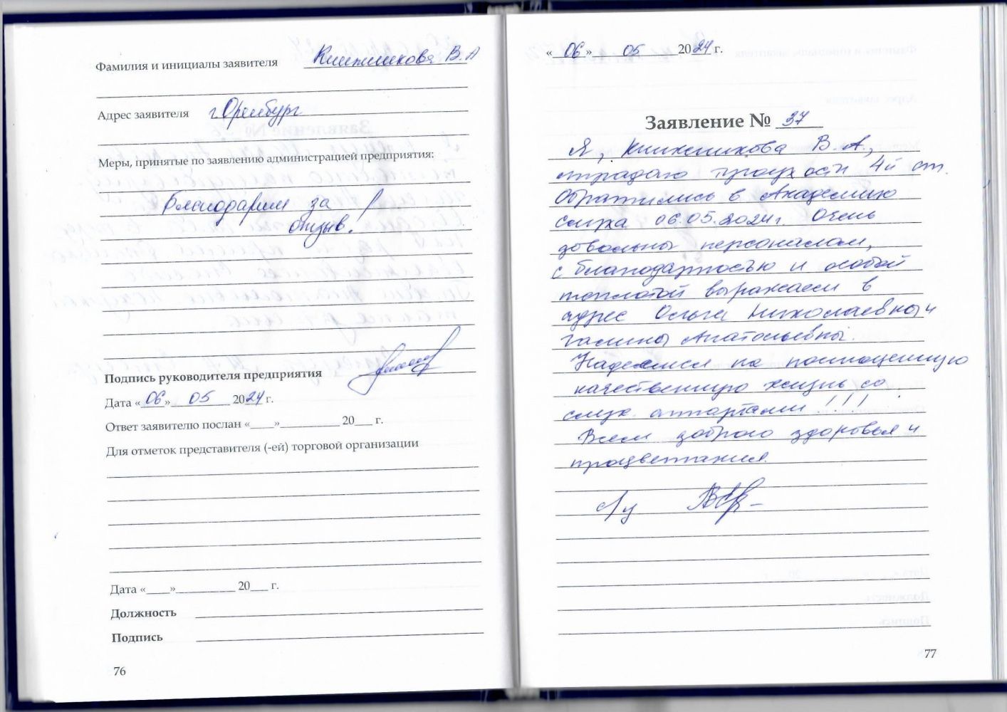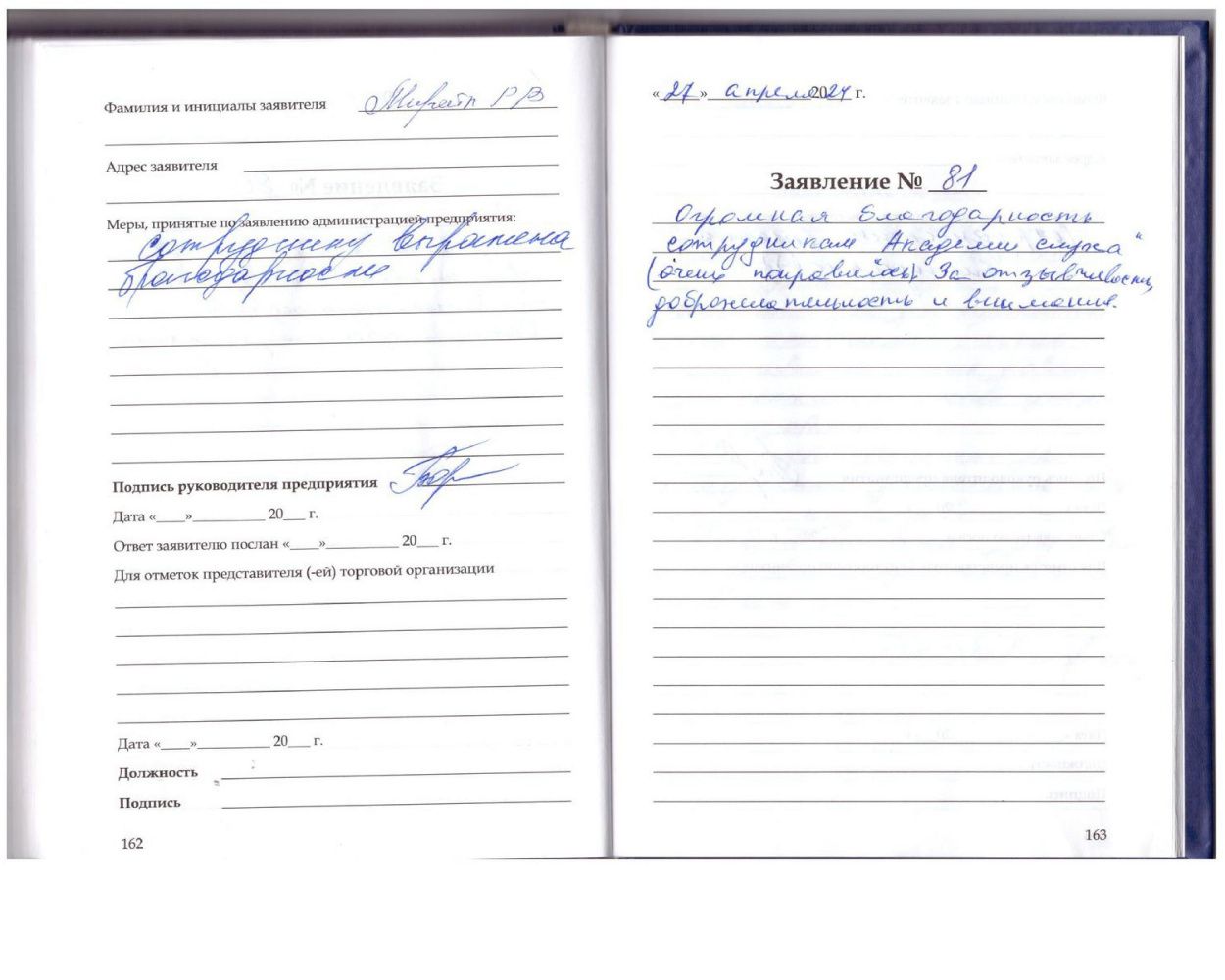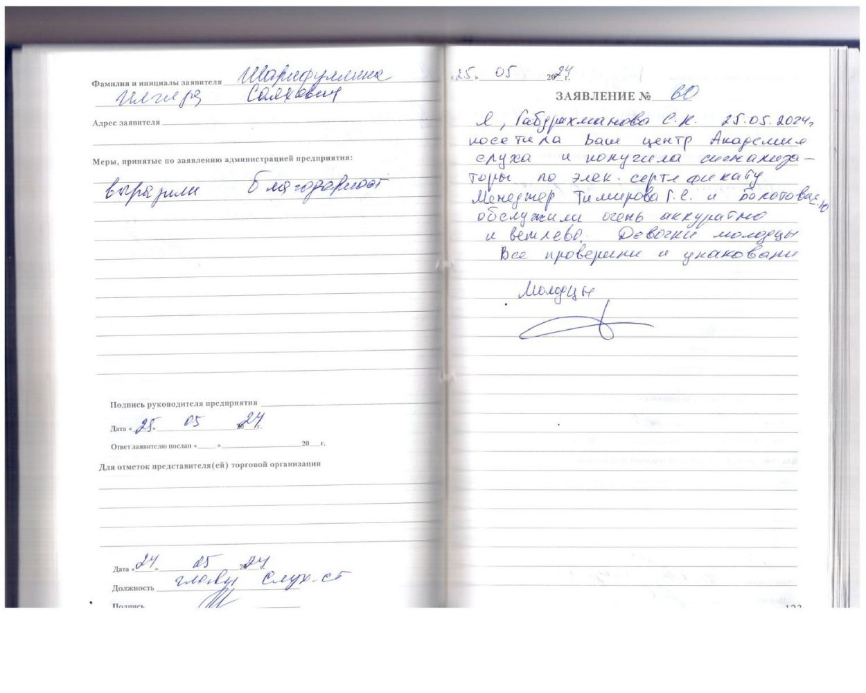 Я, Габдрахманова С.К. 25.05.2024 г. посетила Ваш центр Академия слуха и получила сигнализаторы по элек. сертификату. Менеждер Тимирова Г.С. и Болотова Е.Ю. обслужили очень аккуратно и вежливо. Девочки молодцы. Все проверили и упаковали.