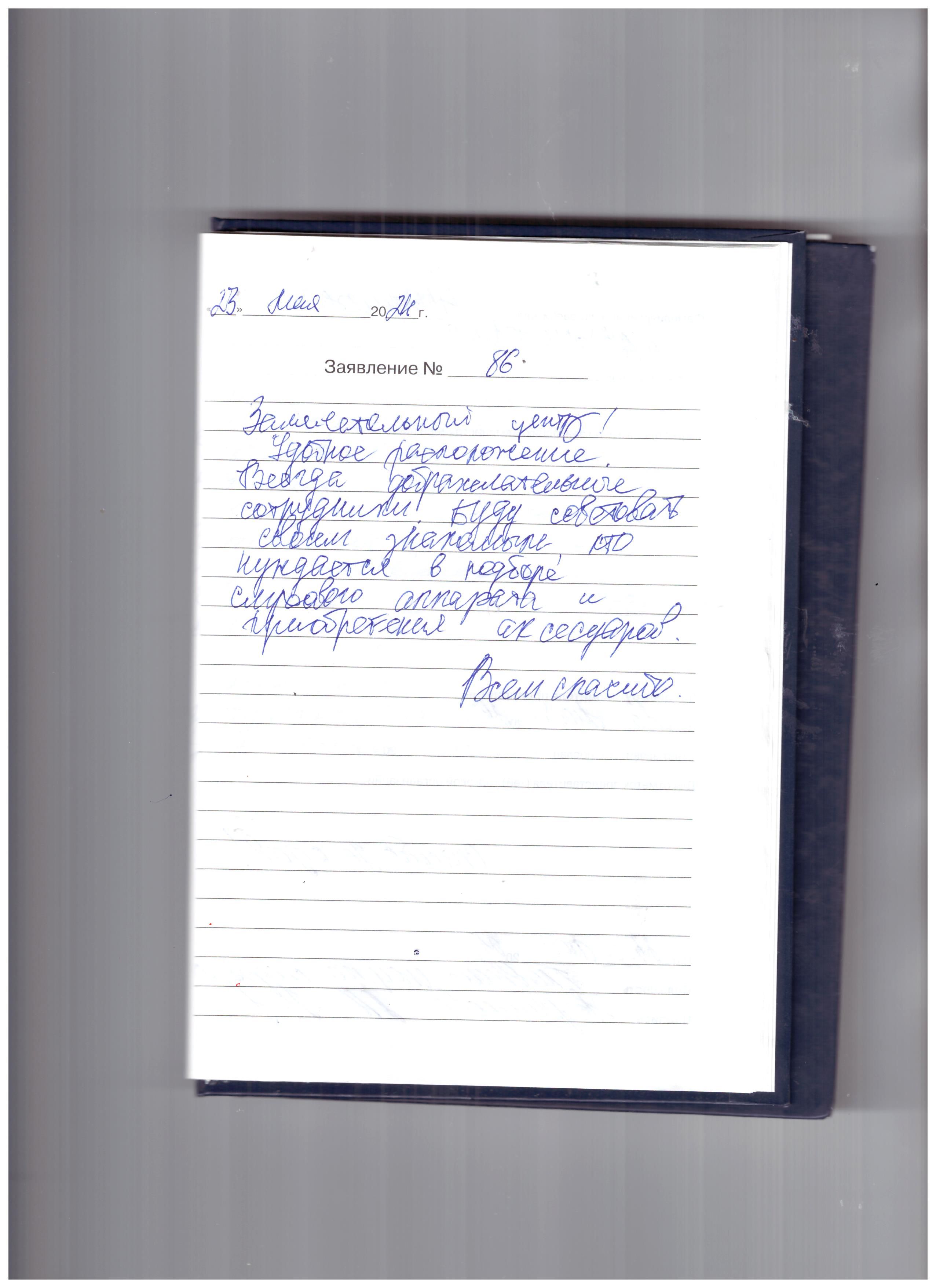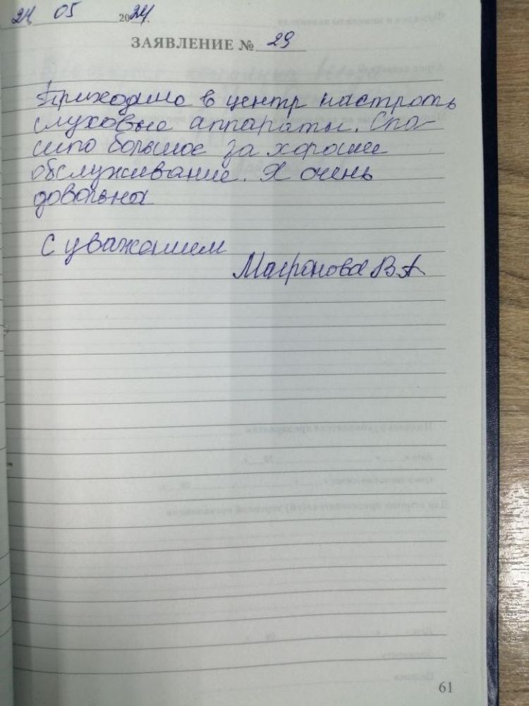 Выражаю благодарность за помощь! За терпение за Ваш труд! Приобрёл слуховой аппарат, очень доволен. Буду к Вам обращаться, снова благодаря Вам слышу. Очень признателен коллективу.