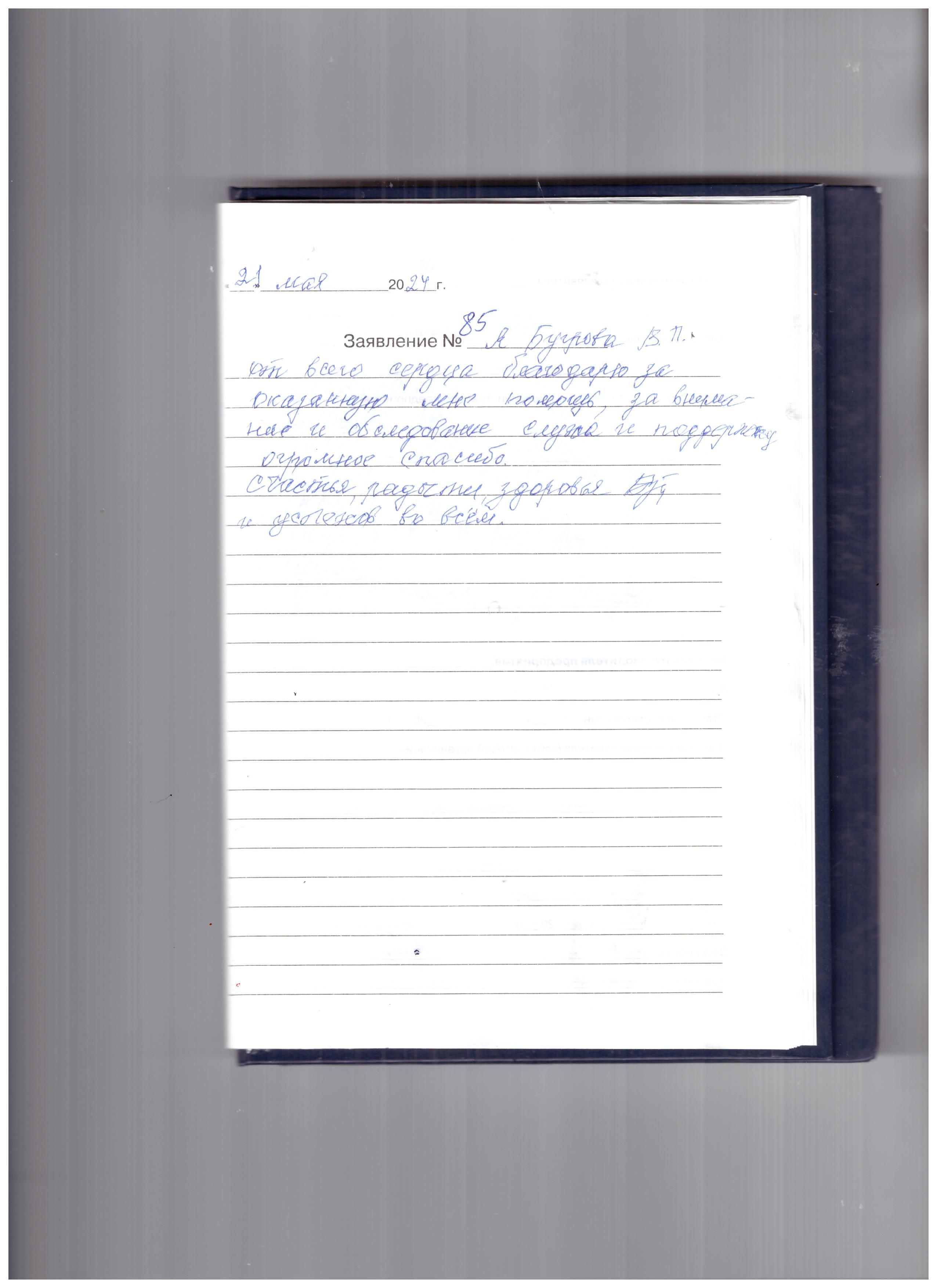 Я Бугрова В.П. от всего сердца благодарю за оказанную мне помощь, за внимание и обследование слуха и поддержку. Огромное спасибо.