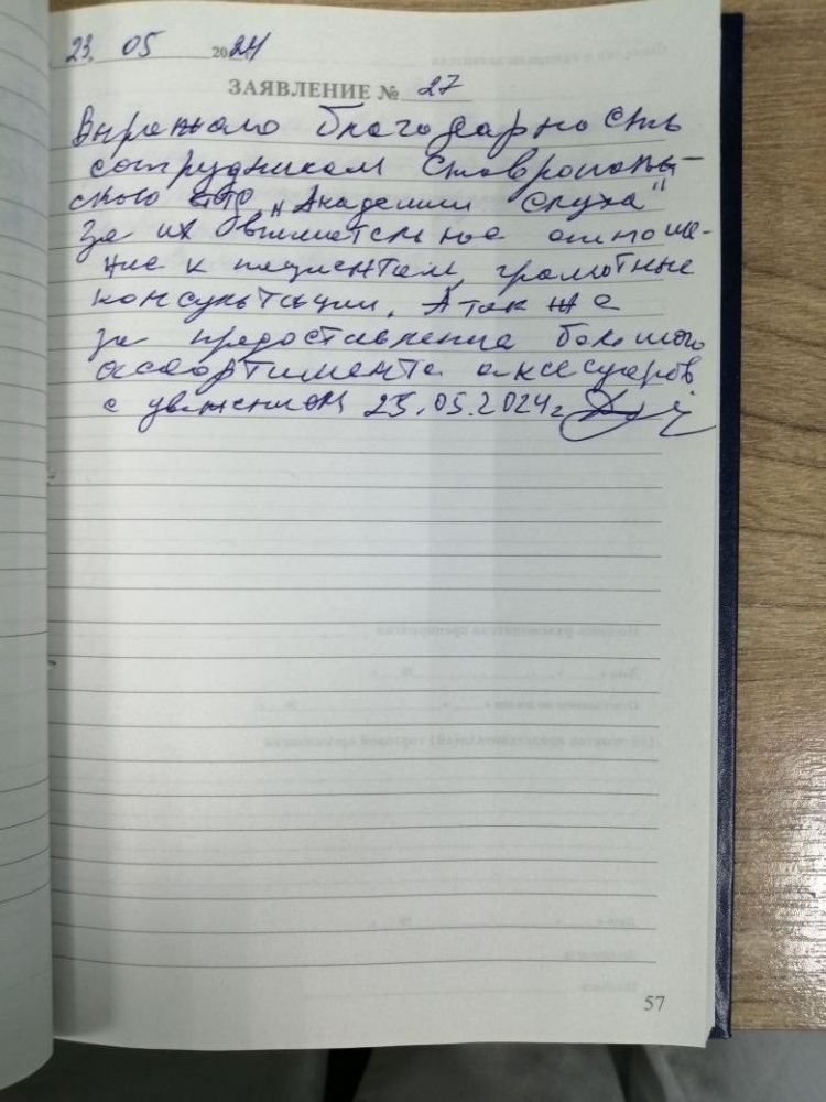 Выражаю благодарность сотрудникам Ставропольского отделения "Академии Слуха" за их внимательное отношение к пациентам, грамотные консультации. А так же за предоставление большого ассортимента аксессуаров.