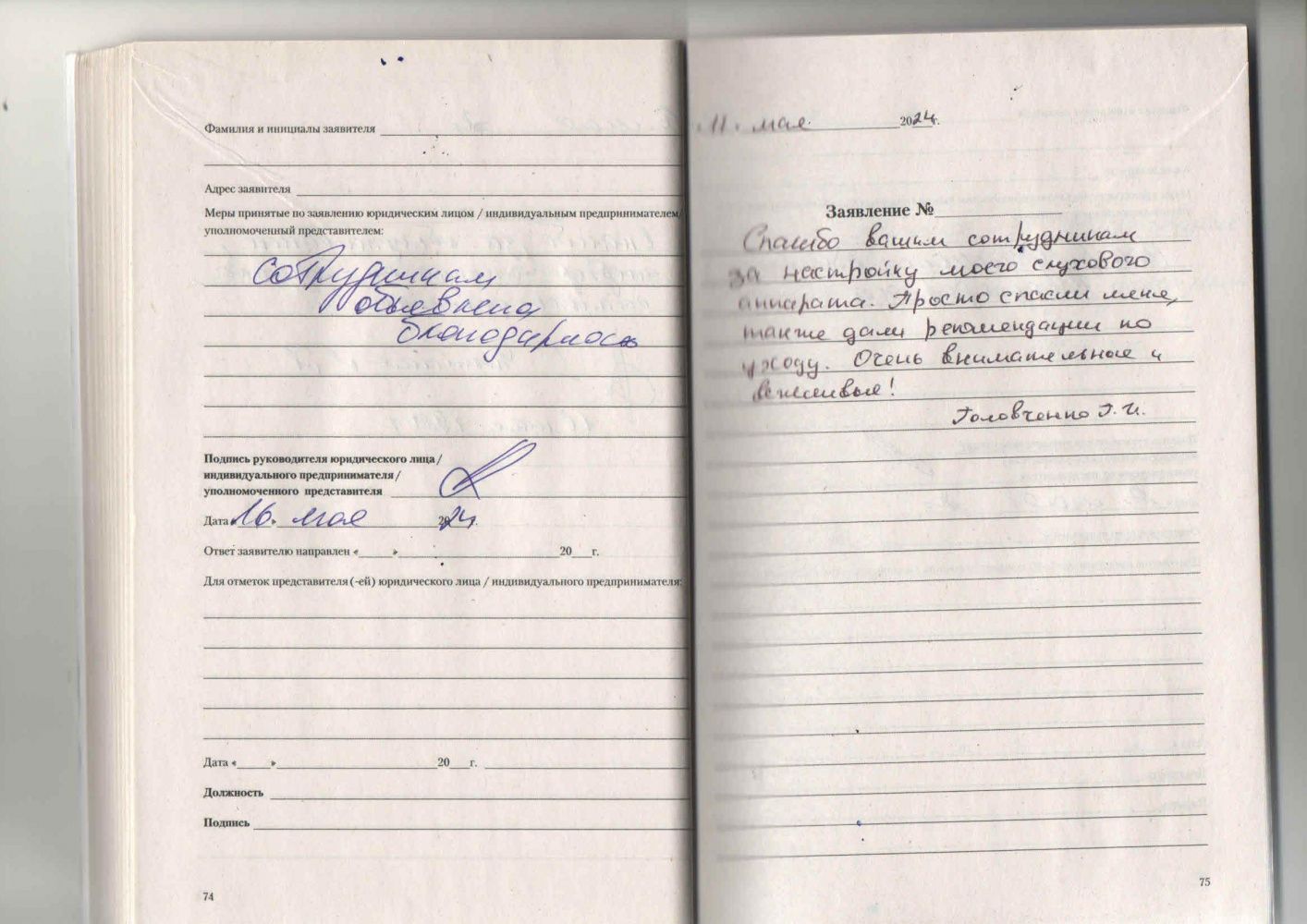 Спасибо вашим сотрудникам за настройку моего слухового аппарата. Просто спасли меня, также дали рекомендации по уходу. Очень внимательные и вежливые!