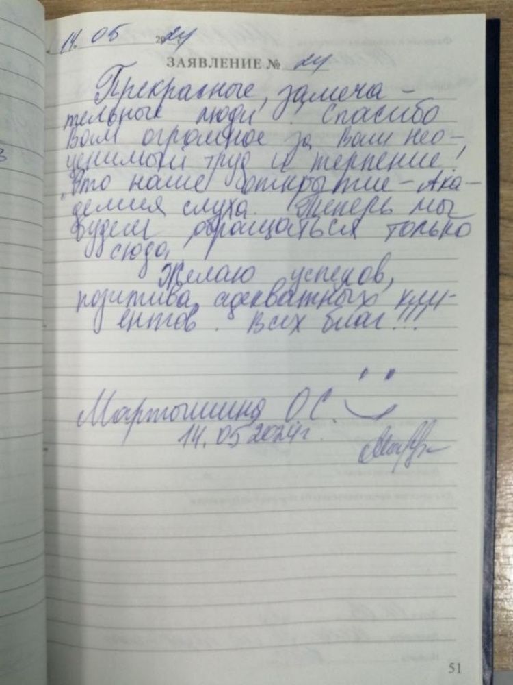 Спасибо вашим сотрудникам за настройку моего слухового аппарата. Просто спасли меня, также дали рекомендации по уходу. Очень внимательные и вежливые!