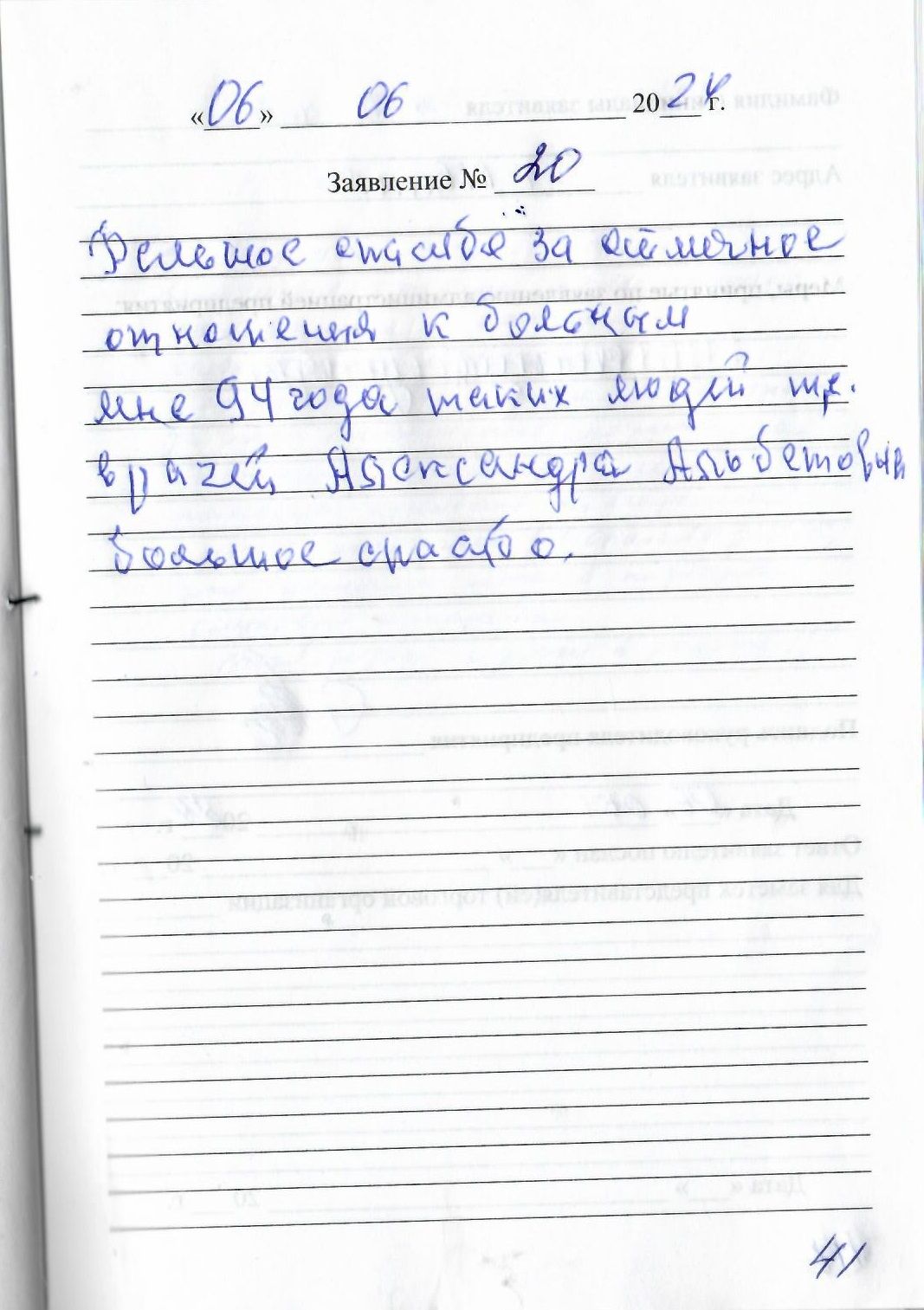 Большое спасибо за отличное отношение к больным. Мне 94 года. Таких людей как врач Александре Альбертовне большое спасибо