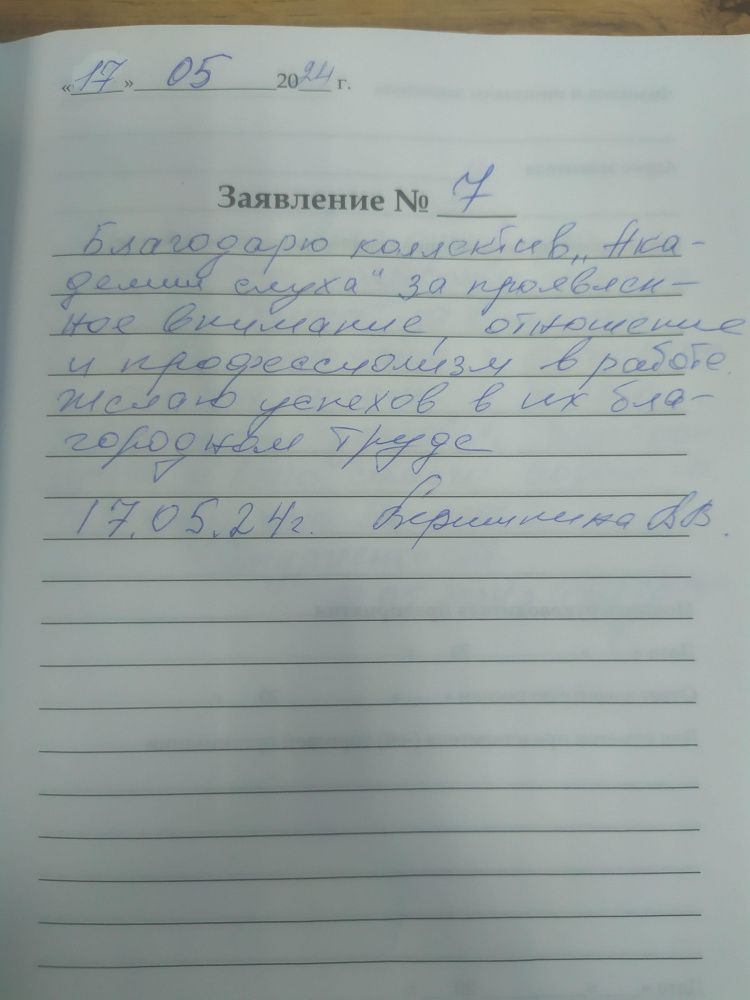Благодарю коллектив "Академии слуха" за проявленное внимание, отношение и профессионализм в работе. Желаю успехов в их благородном труде.