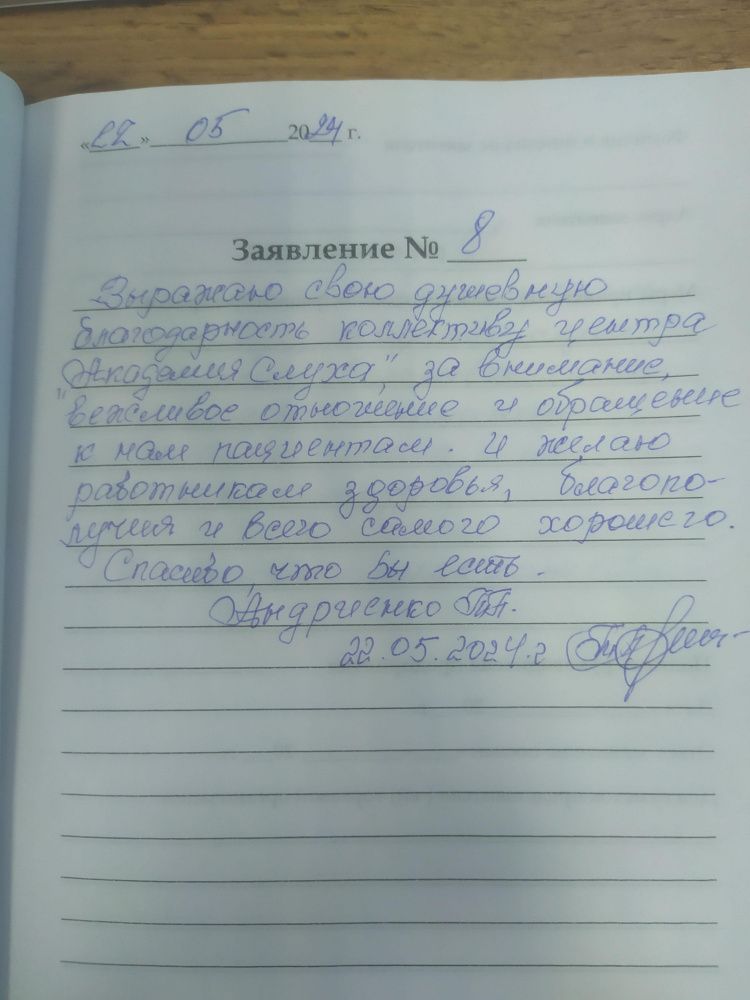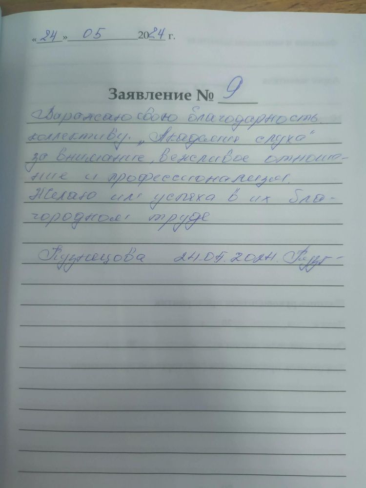 Выражаю свою благодарность коллективу "Академия слуха" за внимание, вежливое отношение и профессионализм. Желаю им успеха в их благородном труде