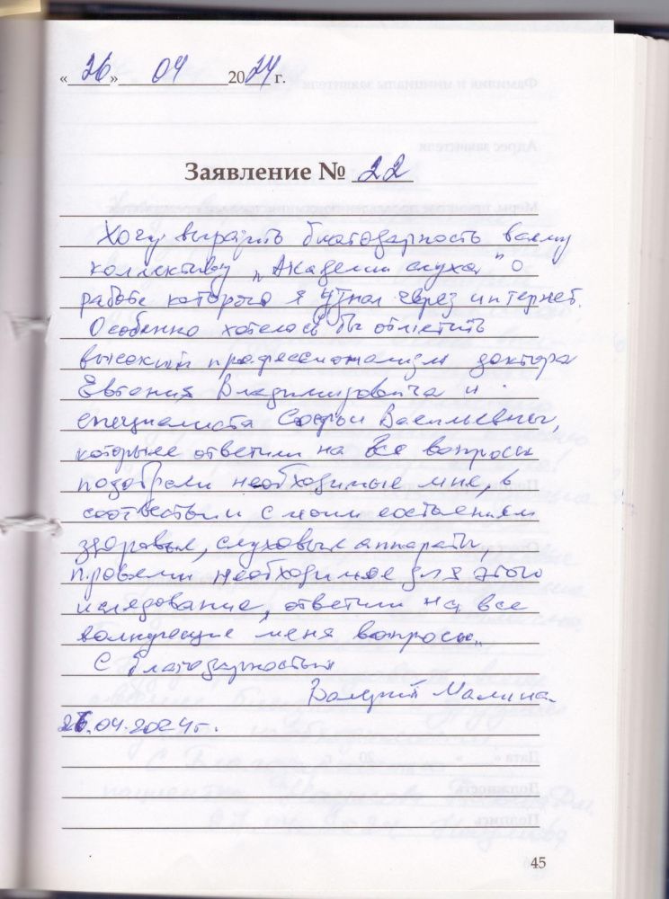 Хочу выразить благодарность всему коллективу "Академии слуха" о работе которого я узнал через интернет. Особенно хотелось бы отметить высокий профессионализм доктора Евгения Владимировича и специалиста Софьи Васильевны, которые ответили на все вопросы, подобрали необходимые мне, в соответствии с моим состоянием здоровья, слуховые аппараты. Провели необходимое для этого исследование, ответили на все волнующие меня вопросы. С благодарностью Валерий Малина.