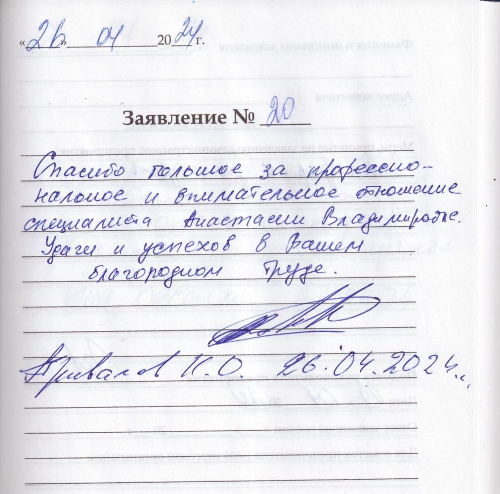 Спасибо большое за профессиональное и внимательное отношение специалиста Анастасии Владимировне.Удачи и успехов в вашем труде.