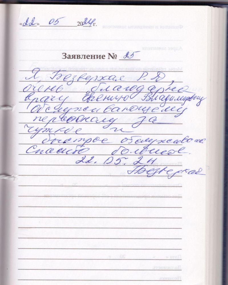 Я, Безверхая Раиса Дмитриевна, благодарна врачу Евгению Владимировичу, обслуживающему персоналу за чуткое и быстрое обслуживание. Спасибо большое.