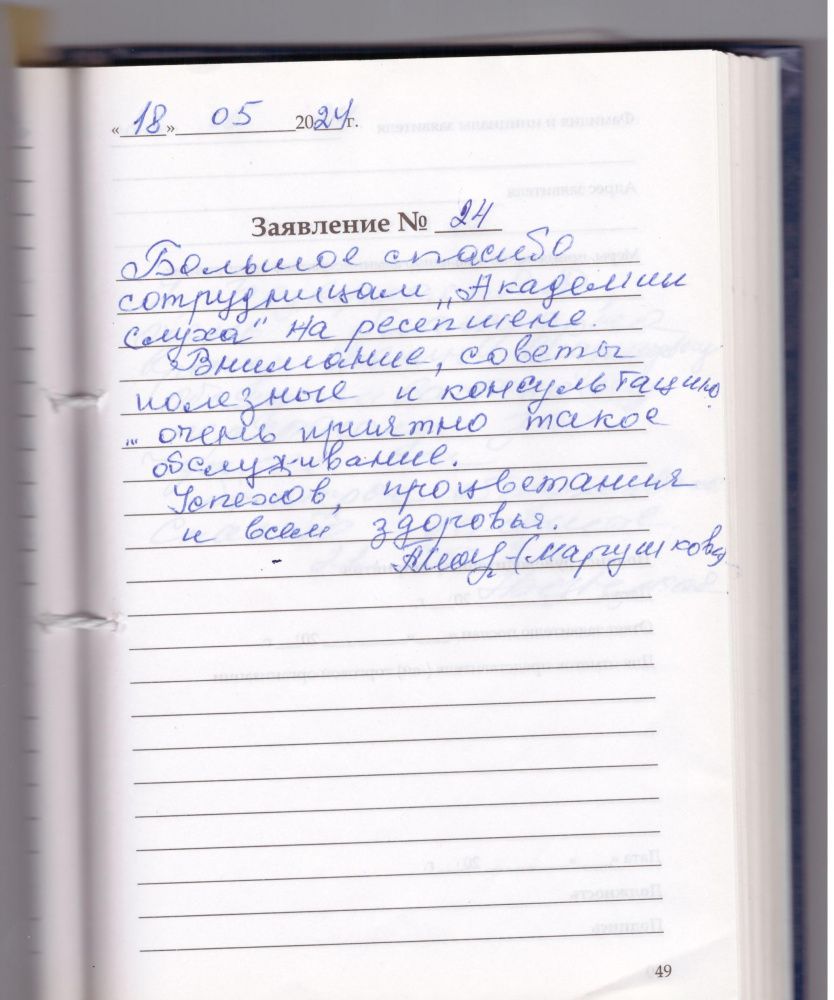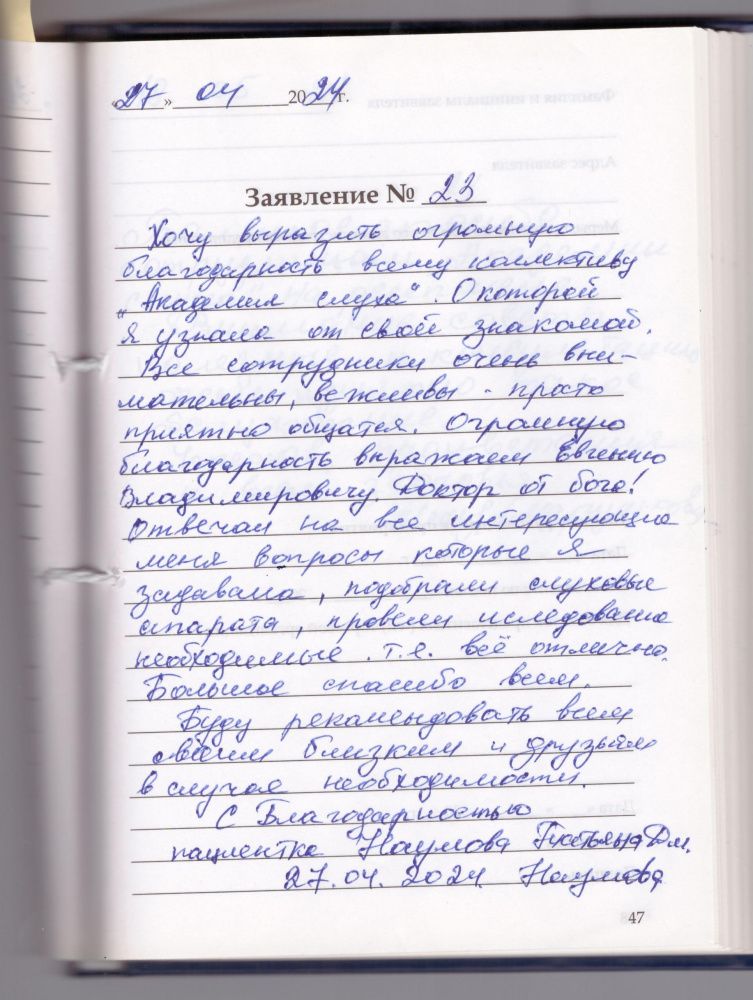 Хочу выразить огромную благодарность всему коллективу "Академия слуха" о которой я узнала от своей знакомой. Все сотрудники очень внимательны, вежливы-просто приятно общаться. Огромную благодарность выражаю Евгению Владимировичу. Доктор от Бога! Отвечал на все интересующие меня вопросы, которые я задавала, подобрали слуховые аппараты, провели исследование необходимое т.е. всё отлично. Большое спасибо всем. Буду рекомендовать всем своим близким и друзьям в случае необходимости. С благодарностью, пациентка Наумова Татьяна Дмитриевна. 27.04.2024г