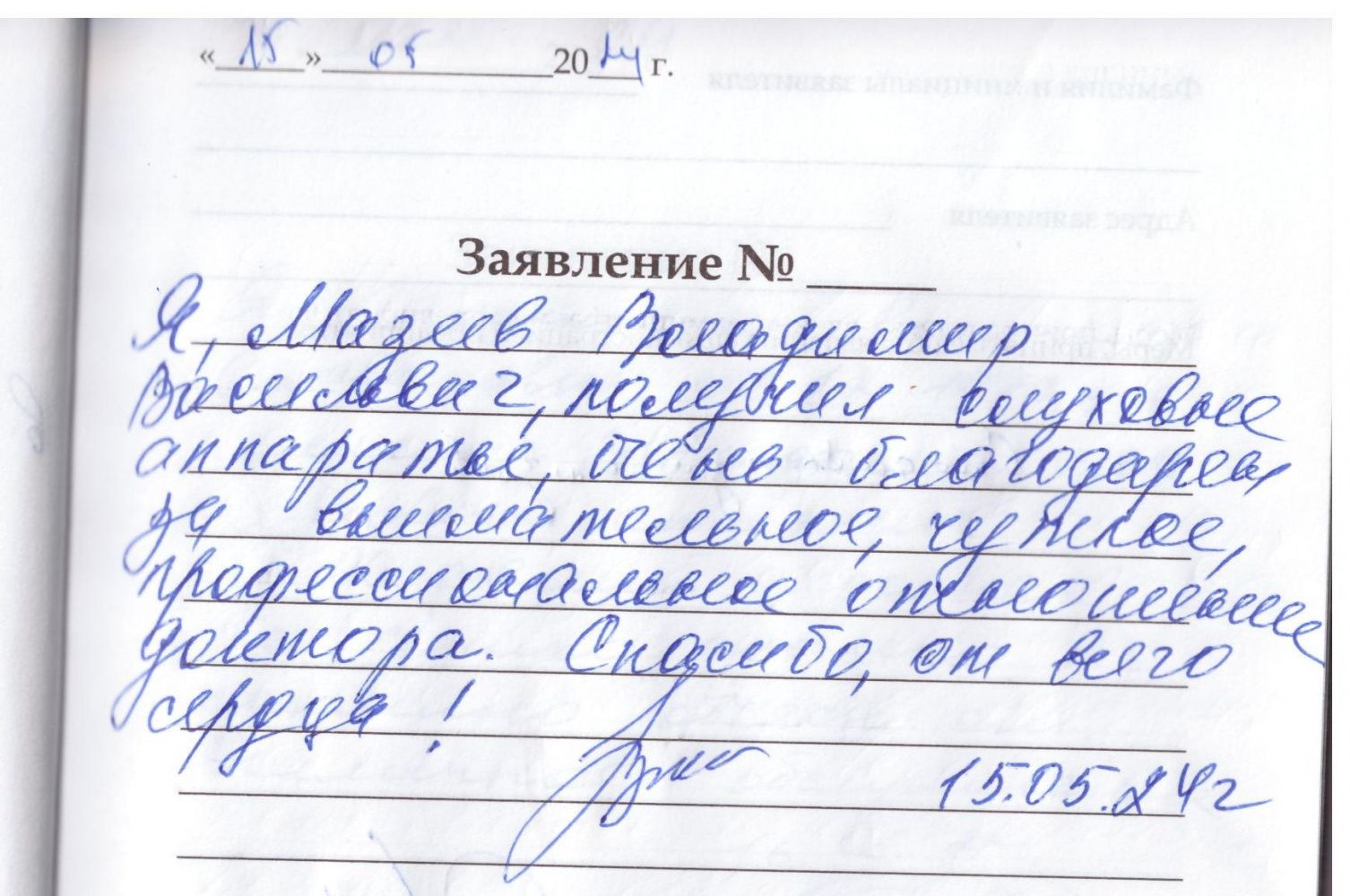 Я, Мазеев Владимир Васильевич, получил слуховые аппараты, очень благодарен за внимательное, чуткое, профессиональное отношение доктора. Спасибо от всего сердца