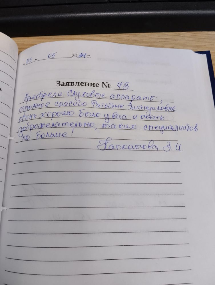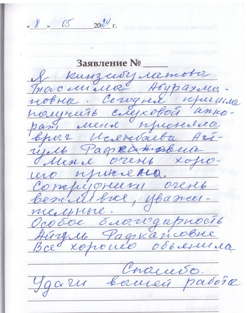 Я, Кинзибулатова Таслима Абдрахимовна. Сегодня пришла получить слуховой аппарат, меня приняла врач Исибаева Айгуль Рафековна.