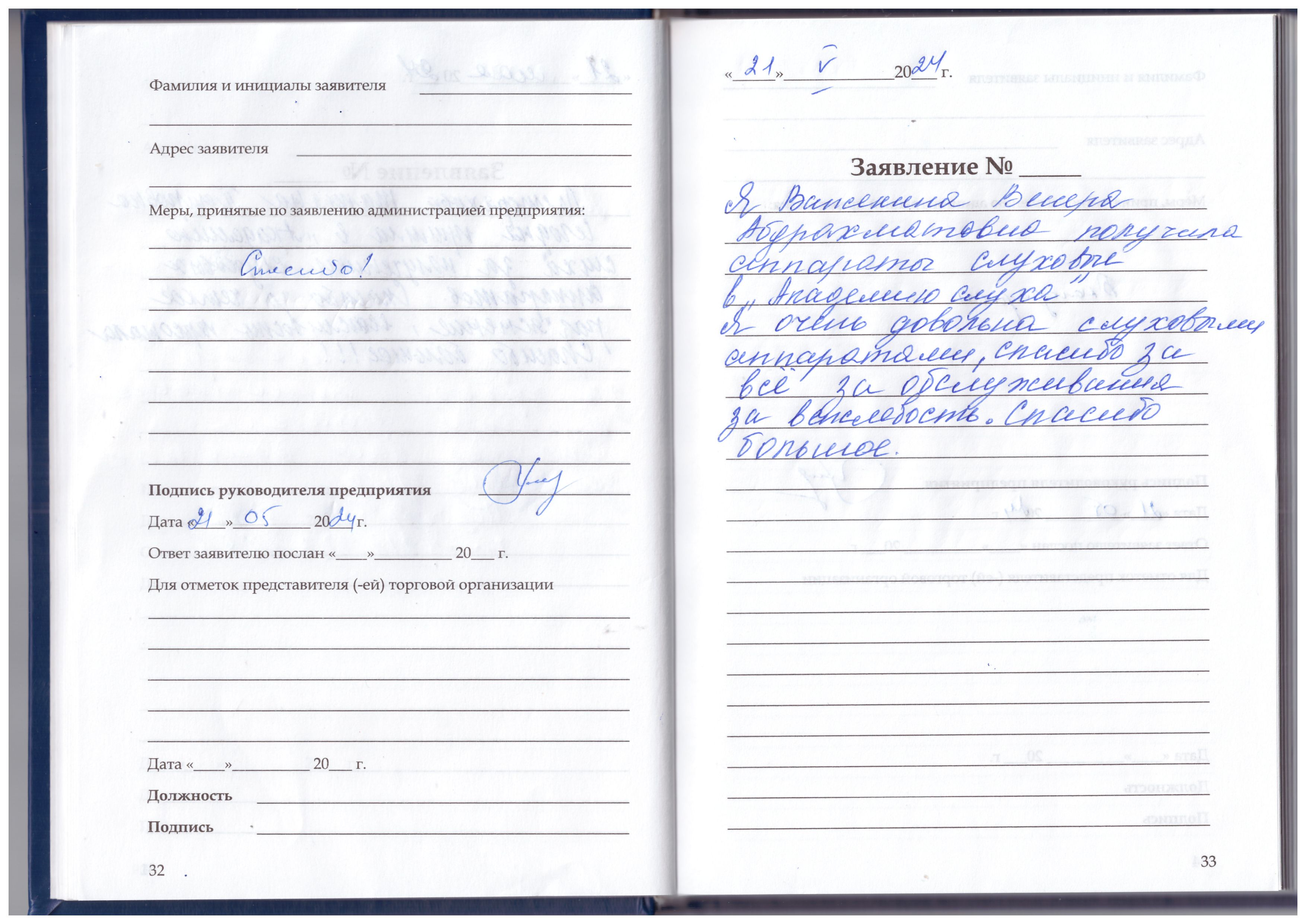 Я, очень довольна слуховыми аппаратами, спасибо за всё за обслуживание и вежливость. Спасибо большое.