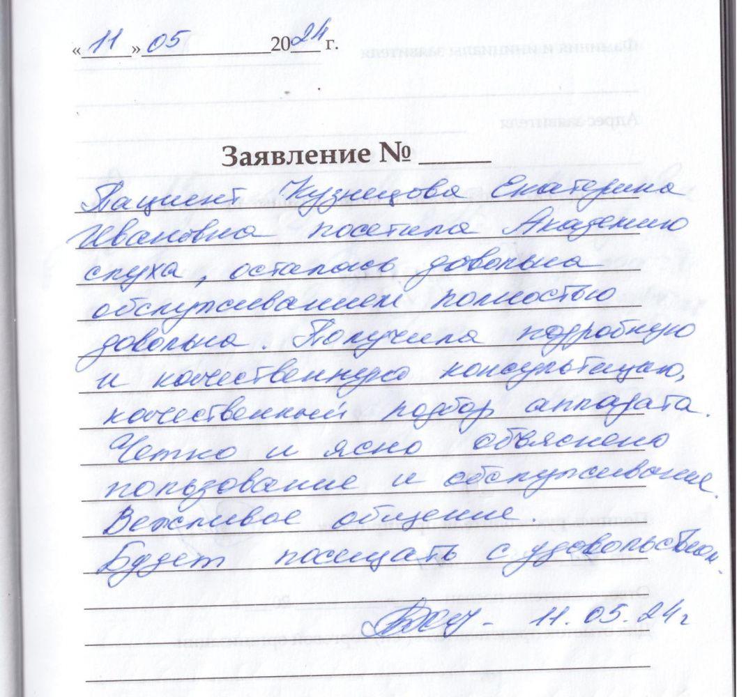Я, пациент, Кузнецова Екатерина Ивановна, посетила Академию слуха, осталась довольна обслуживанием полностью довольна. Получила подробную и качественную консультацию, качественный подбор аппарата. Чётко и ясно объяснено использование и обслуживание.