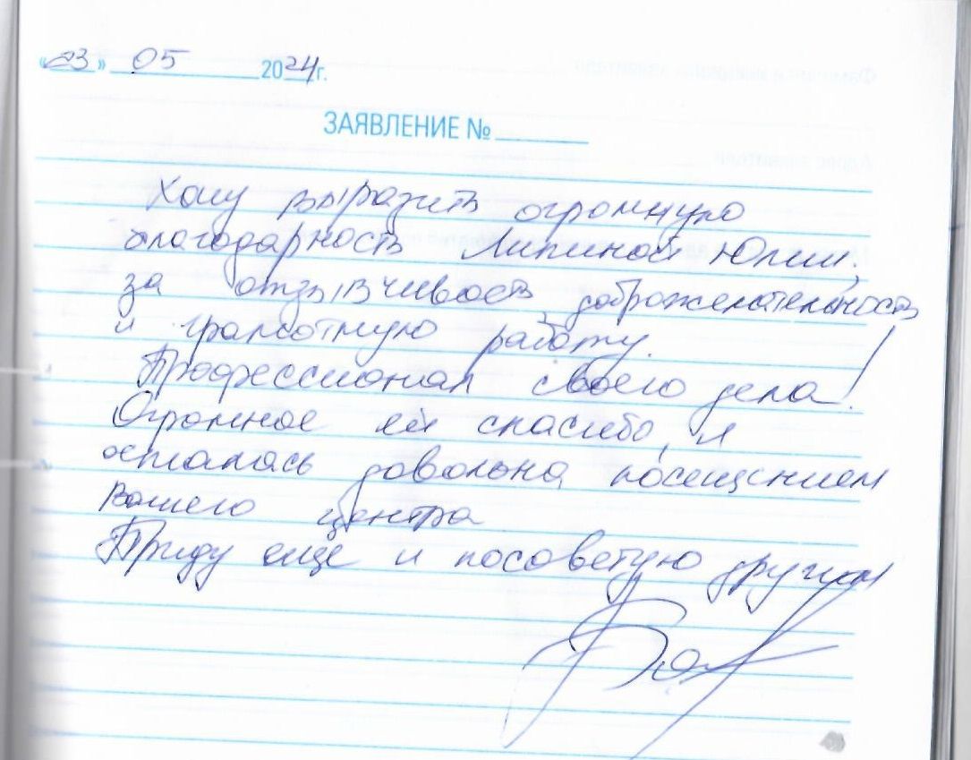Хочу выразить огромную благодарность Липиной Юлии за отзывчивость, доброжелательность и грамотную работу. Профессионал своего дела! Огромное ей спасибо, я осталась довольна посещением вашего центра. Приду еще и посоветую другим.