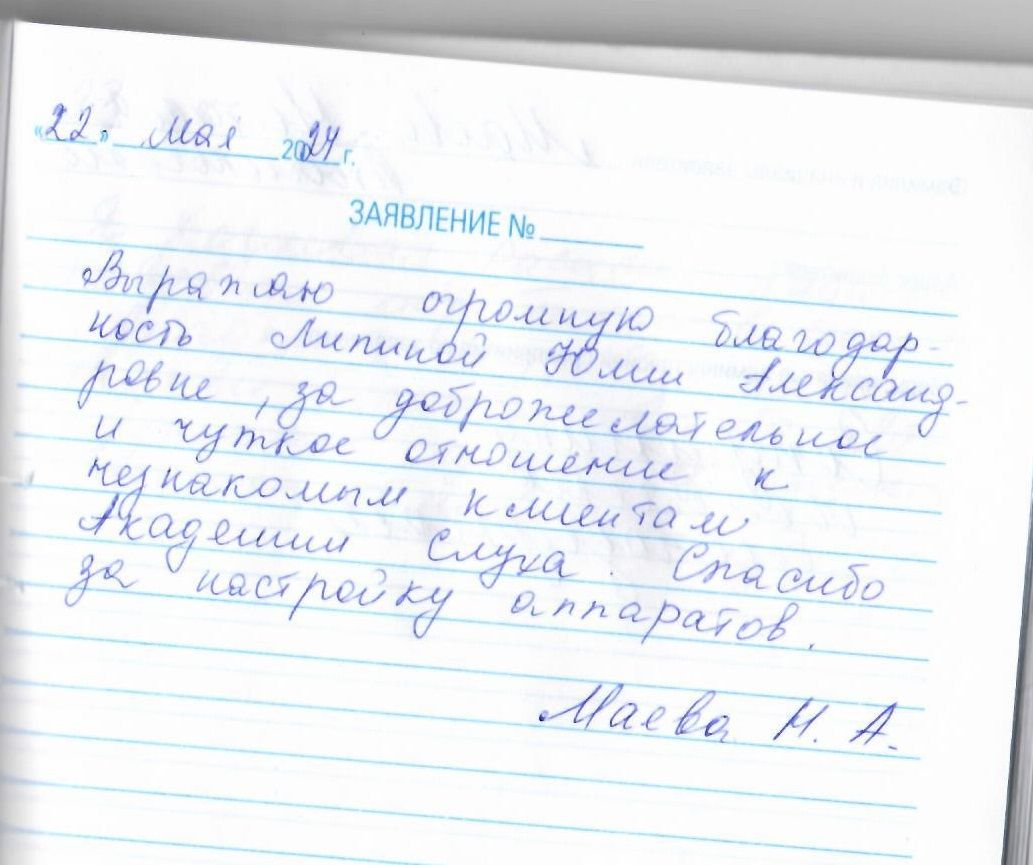 Выражаю огромную благодарность Липиной Юлии Александровне, за доброжелательное и чуткое отношение к незнакомым клиентам Академии слуха. Спасибо за настройку аппаратов.