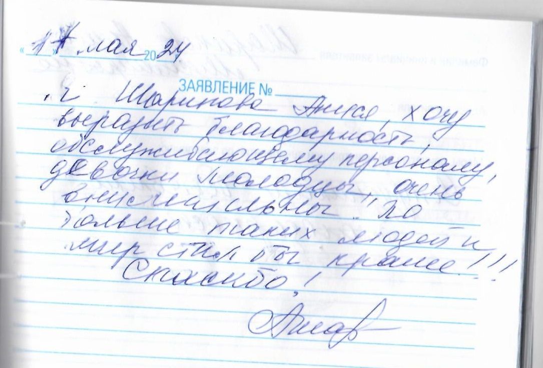 Я, Шарипова Аниса Мусамировна, хочу выразить благодарность обслуживающему персоналу, девочки молодцы, очень внимательные. Побольше бы таких людей и мир стал бы краше!!! Спасибо!