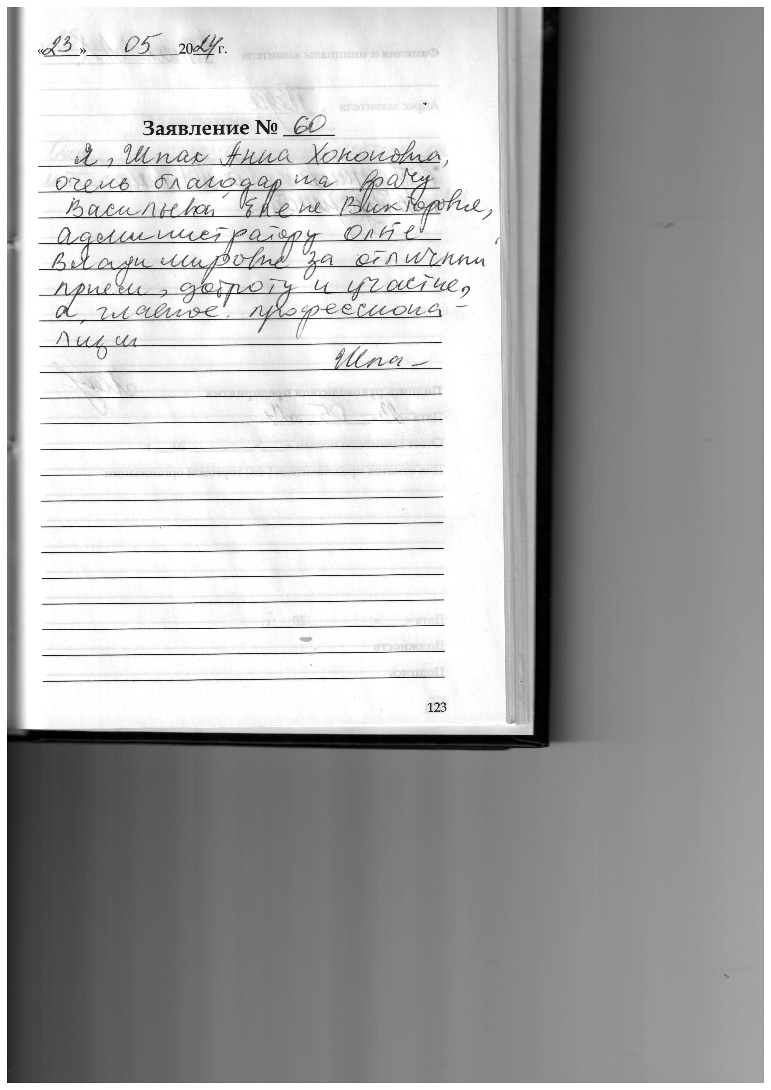 Я, Шпак Анна Хононовна, очень благодарна врачу Васильевой Елене Викторовне, администратору Ольге Владимировне за отличный приём, доброту и участие, а главное профессионализм.