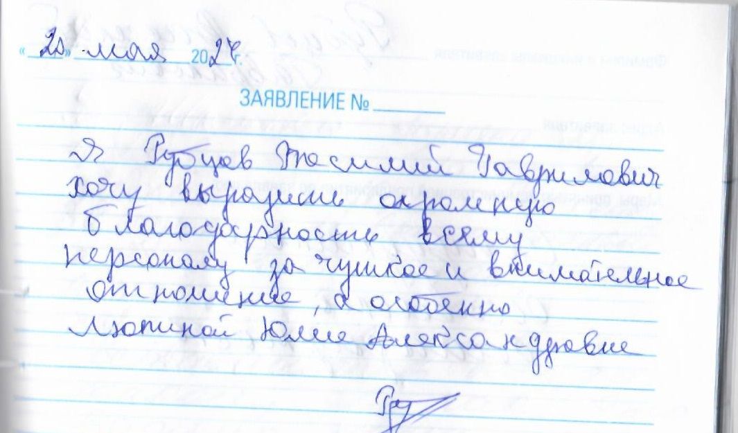 Я, Рубцов Василий Гаврилович, хочу выразить огромную благодарность всему персоналу за чуткое и внимательное отношение, а особенно Липиной Юлии Александровне.
