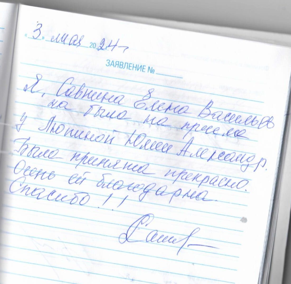 Я, Савнина Елена Васильевна, была на приеме у Липиной Юлии Александровны. Была принята прекрасно. Очень ей благодарна. Спасибо!!!