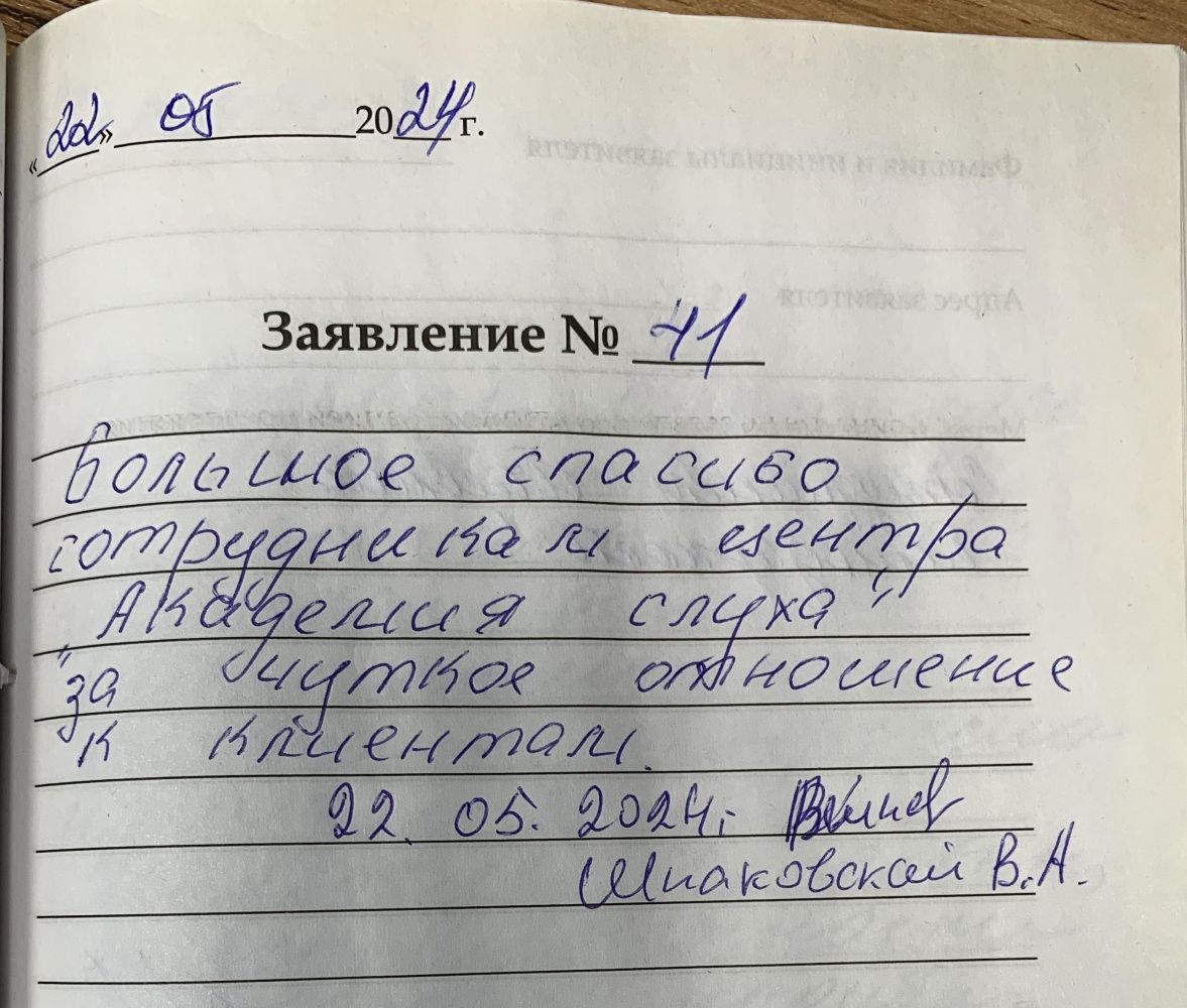 Большое спасибо сотрудникам центра «Академия Слуха» за чуткое отношение к клиентам. 22.05.2024 Шпаковский В.А.