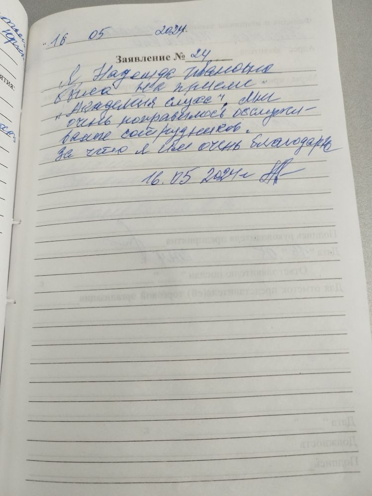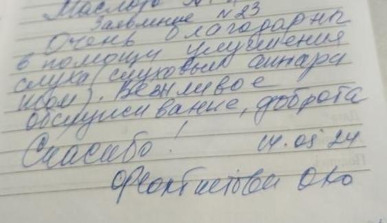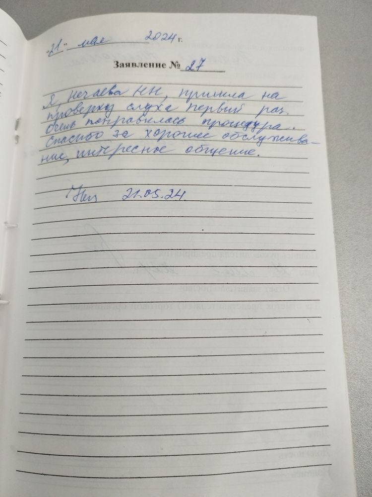 Очень благодарна в помощи улучшения слуха (слуховым аппаратом).Вежливое обслуживание, доброта. Спасибо! 14.05.2024 Феоктистова О.Ю.