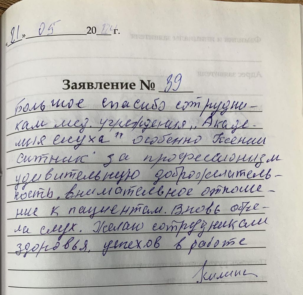 Большое спасибо сотрудникам мед. учреждения "Академия Слуха". Особенно Ксении Ситник за профессионализм, удивительную доброжелательность, внимательное отношение к пациентам. вновь обрела слух. Желаю сотрудникам здоровья, успехов в работе.