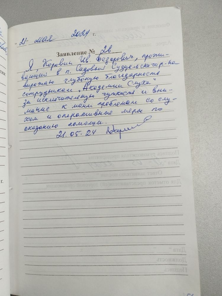 Я, Коровин Иван Федорович, проживающий в п. Садовый Суздальского р-на выражаю глубокую благодарность сотрудникам "Академии Слуха" за исключительную гибкость и внимание к моим проблемам со слухом и оперативные меры по оказанию помощи.