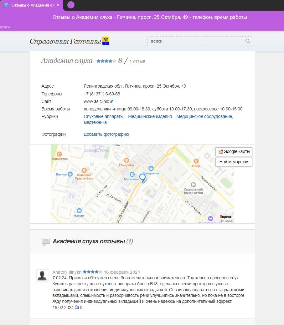 07.02.24 Принят и обслужен благожелательно и внимательно. Тщательно проверен слух. Купил в рассрочку два слуховых аппарата Aurica B13, сделаны слепки проходов в ушных раковинах для изготовления индивидуальных вкладышей. Осваиваю аппараты со стандартными вкладышами, слышимость и разборчивость речи улучшились значительно, но пока не в восторге. Жду получения индивидуальных вкладышей и очень надеюсь на дополнительный эффект.