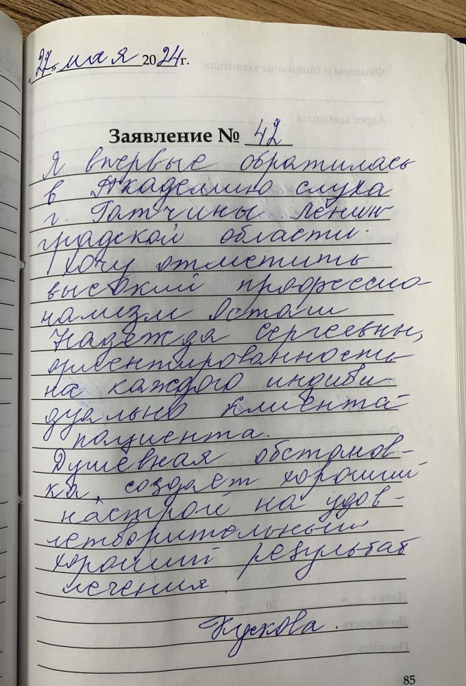 Я впервые обратилась в Академию Слуха г. Гатчины Ленинградской области. Хочу отметить высокий профессионализм Осташ Надежды Сергеевны, ориентированность на каждого индивидуально клиента-пациента. Душевная обстановка создаёт хороший настрой на удовлетворительный хороший результат лечения. Кускова.
