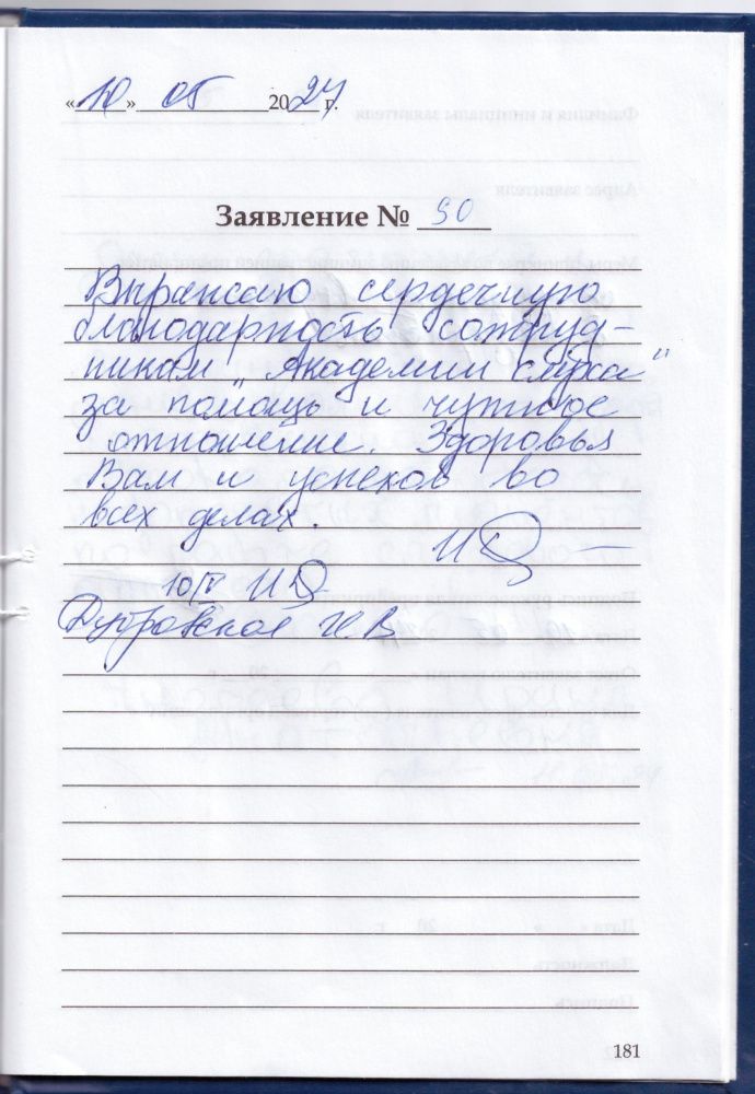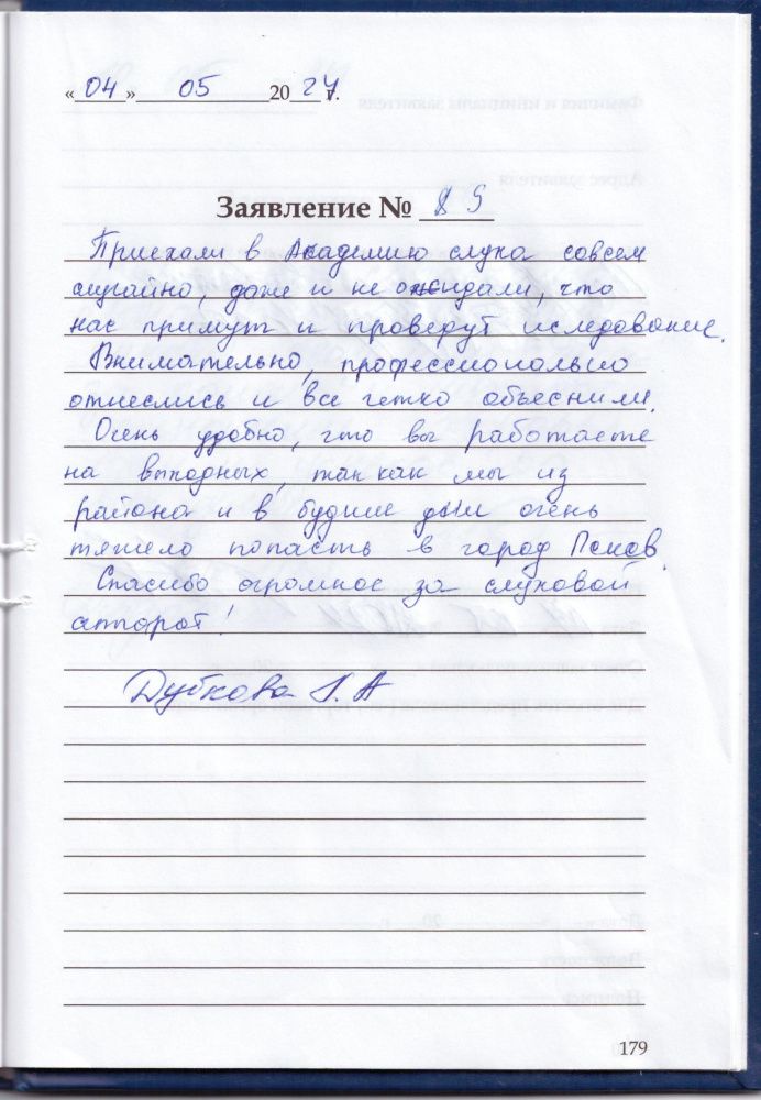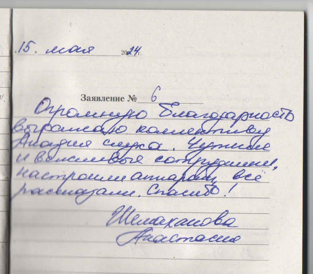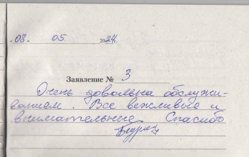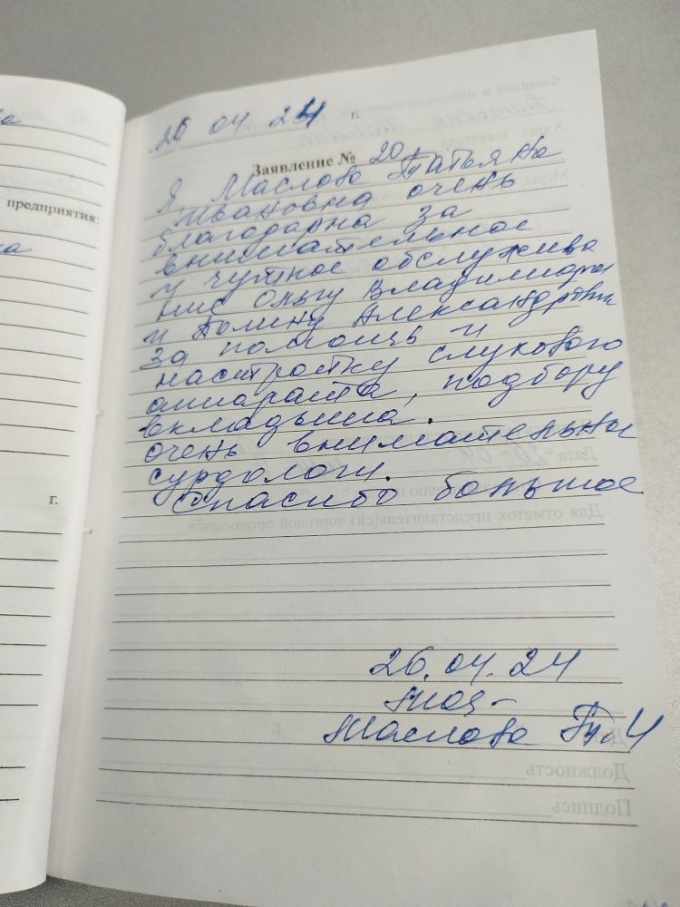 Я, Маслова Татьяна Ивановна очень благодарна за внимательное и чуткое обслуживание Ольгу Владимировну и Полину Александровну за помощь и настройку слухового аппарата, подбору вкладыша. Очень внимательные сурдологи. Спасибо большое. 26.04.2024. Маслова Т.И.