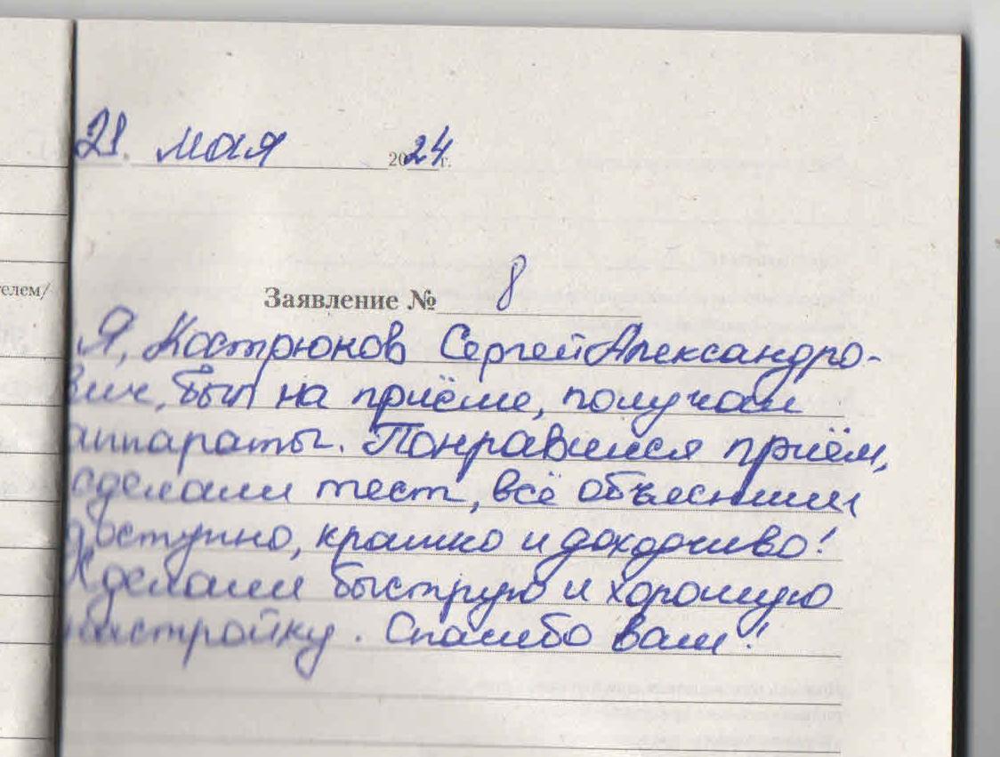 Я, Кострюков Сергей Александрович, был на приеме, получал аппараты. Понравился прием, сделали тест, все объяснили доступно, кратно и доходчиво! Сделали быструю и хорошую настройку. Спасибо вам!