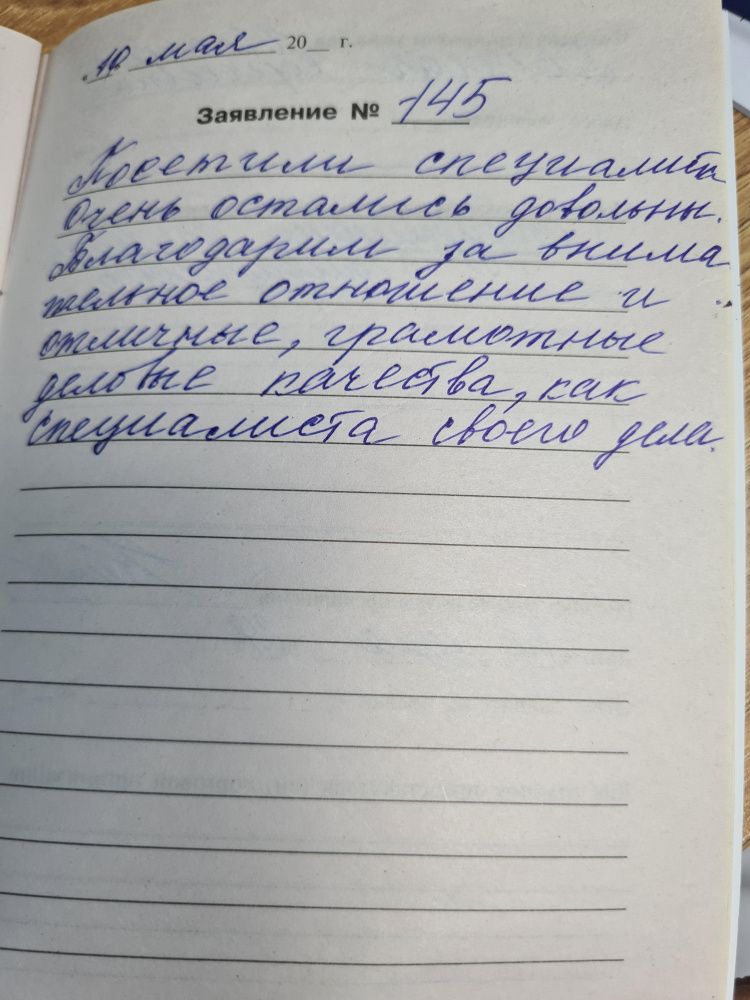 10.05.2024 Посетили специалиста. Очень остались довольны. Благодарим за внимательное отношение и отличные, грамотные деловые качества, как специалиста своего дела