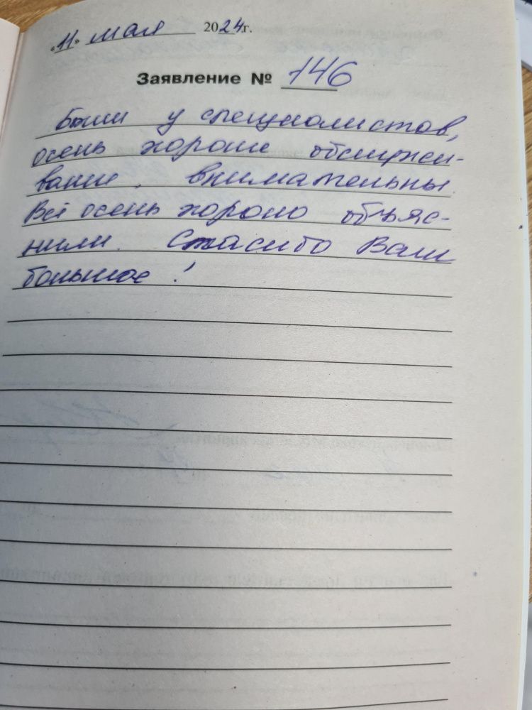 11.05.2024 Были у специалистов, очень хорошее обслуживание, внимательны. Всё очень хорошо объяснили. Спасибо вам большое!