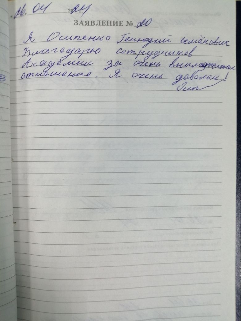 Я Осипенко геннадий Семенович Благодарю сотрудников Академии за очень внимательное отношение. Я очень доволен!
