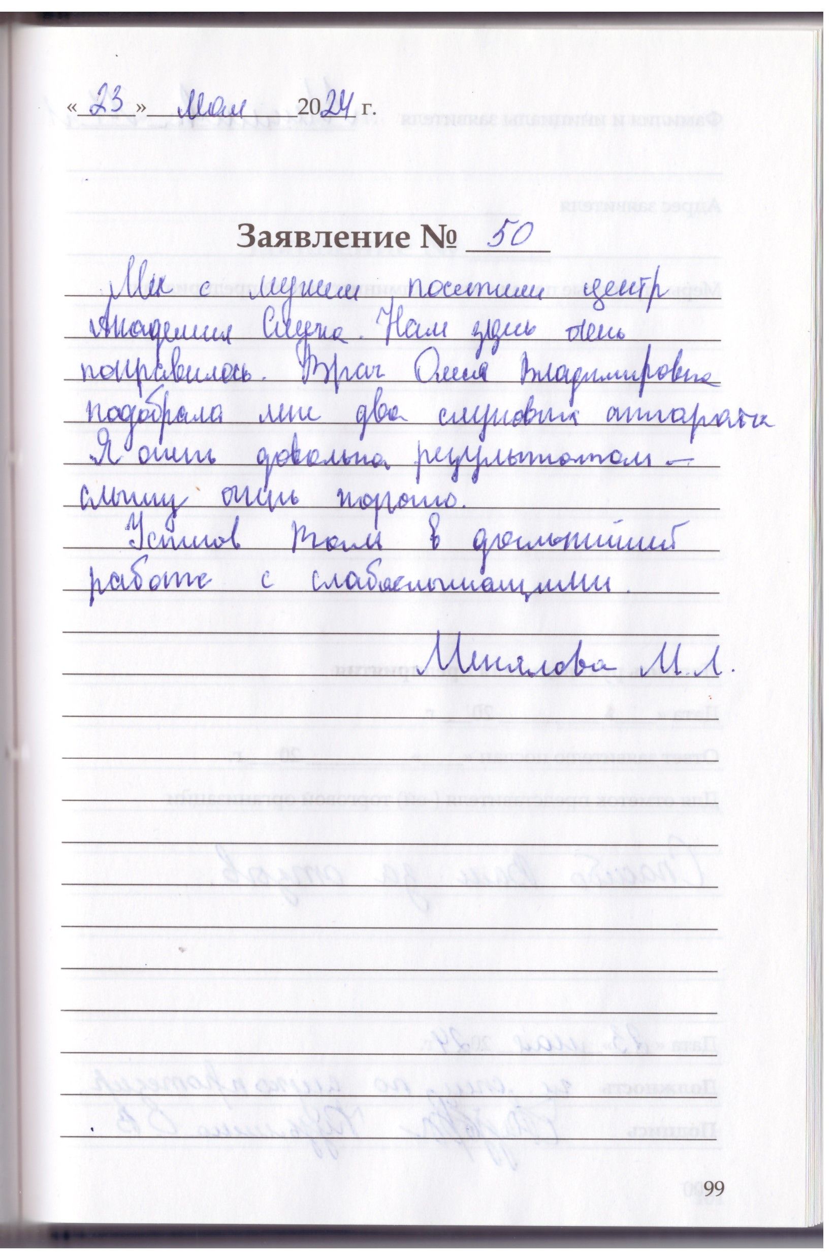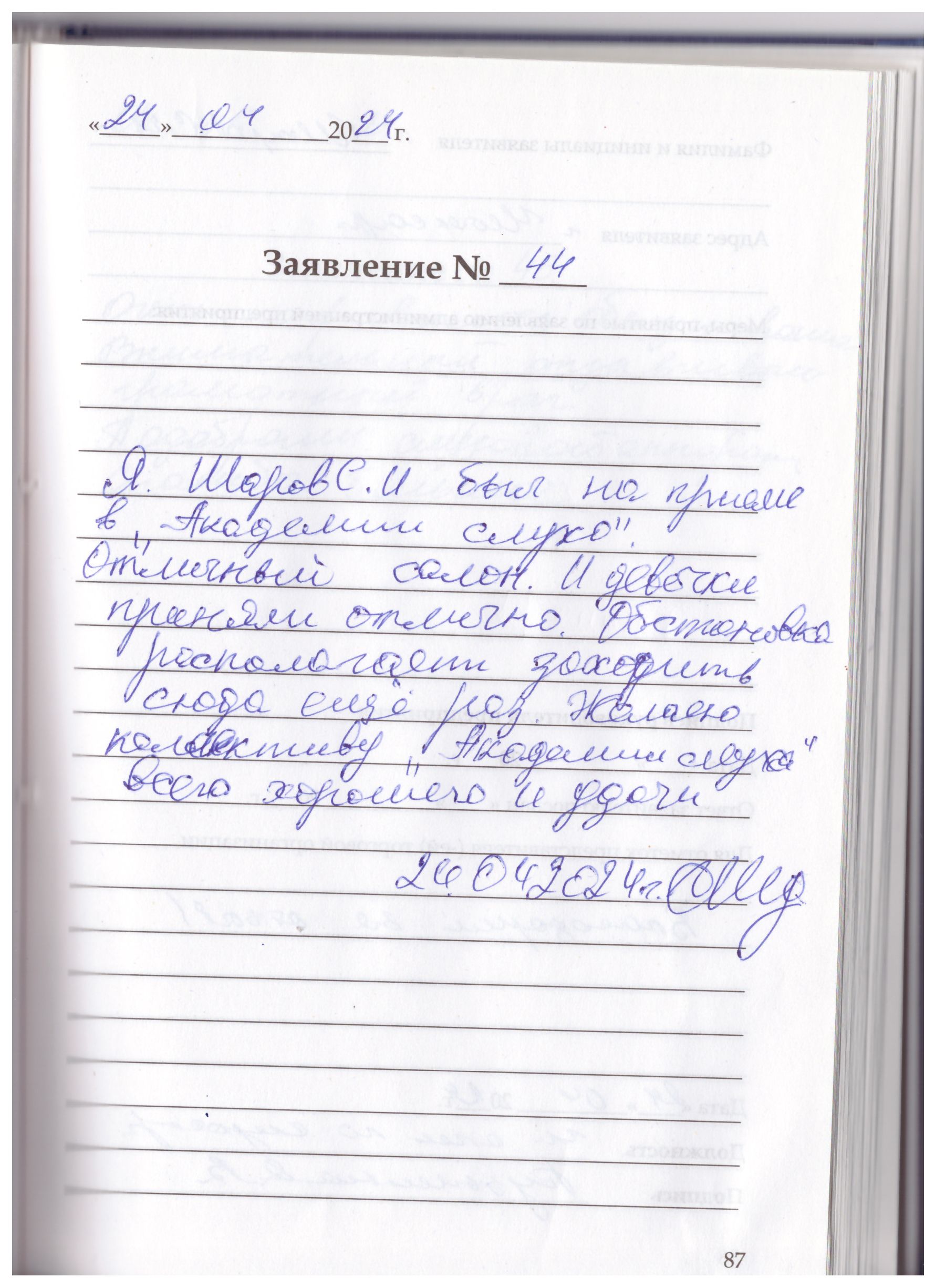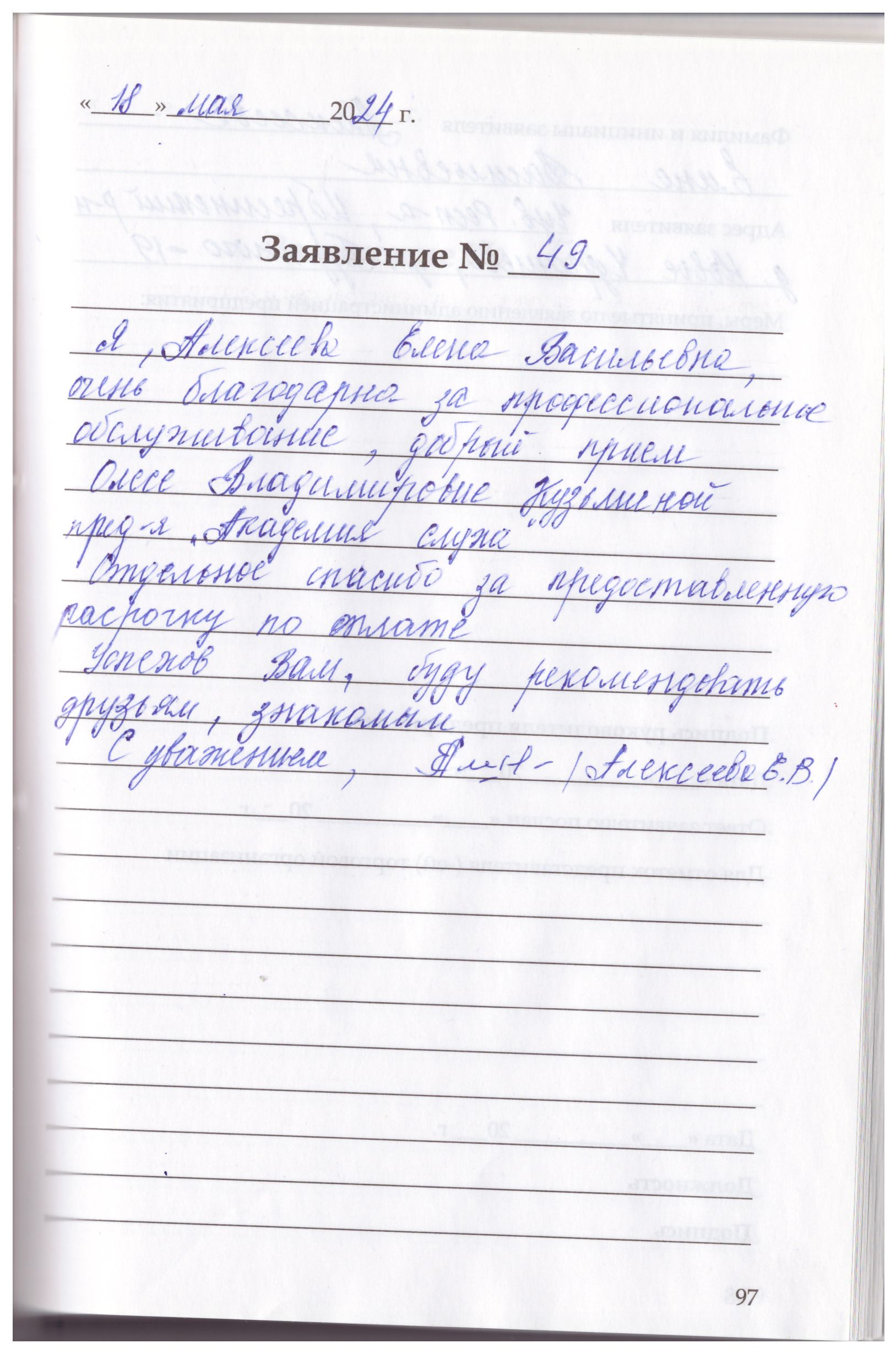 Я, Алексеева Елена Васильевна, очень благодарна за профессиональное обслуживание, добрый прием Олесе Владимировне Кузьминой пред-я «Академия слуха».