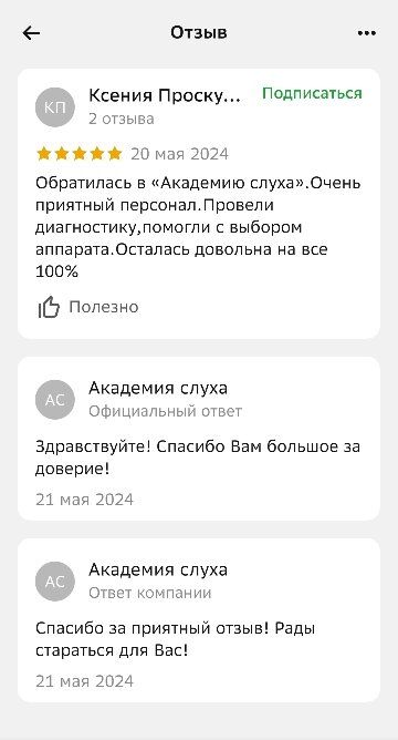 Очень вежливое общение сотрудниц Академии Слуха. Все понятно и чётко объясняют, отвечают на все вопросы. Хорошо, что подобрал аппараты именно у Вас.
