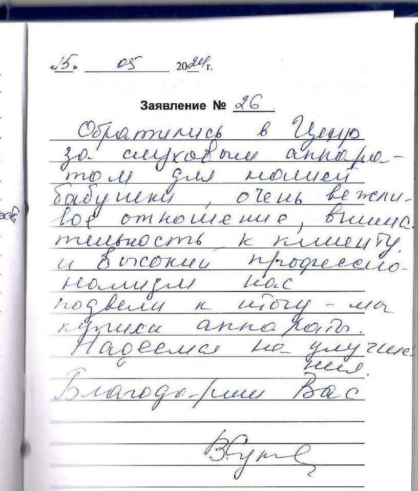 Обратилась за поднастройкой аппарата, девочки записали на ближайшее время. Настройку производила Хордикова О.Н. Очень качественно, доступно объяснила как пользоваться программами. Устранила шум, который мне мешал. Спасибо за вашу доброту и трепение.